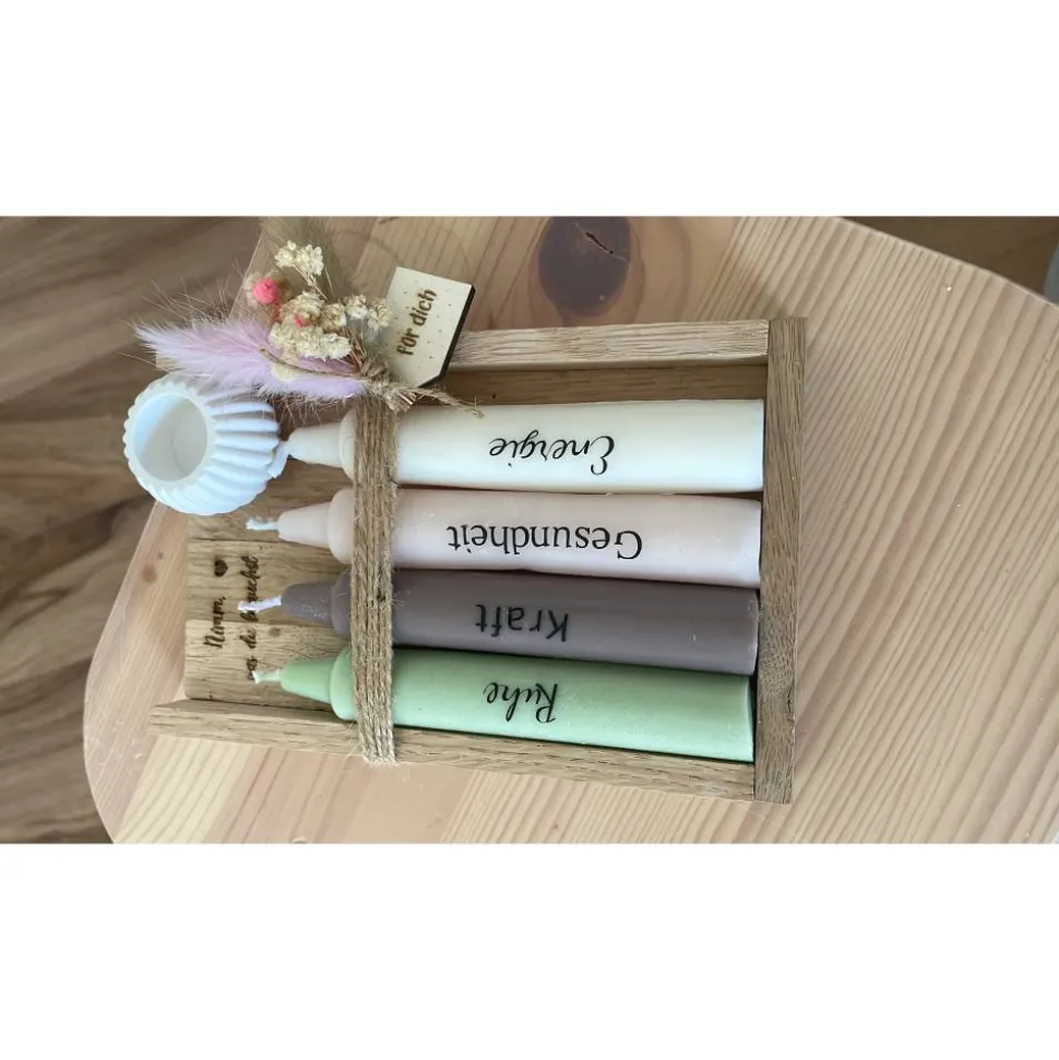 Das liebevoll gestaltete Set besteht aus vier Kerzen mit den inspirierenden Worten Ruhe, Kraft, Gesundheit und Energie. Jede Kerze ist sorgfältig in einen dekorativen Holzhalter eingefasst, mit Trockenblumen und einem hübschen Anhänger verziert. So entsteht ein einzigartiges Geschenk mit persönlicher Bedeutung.