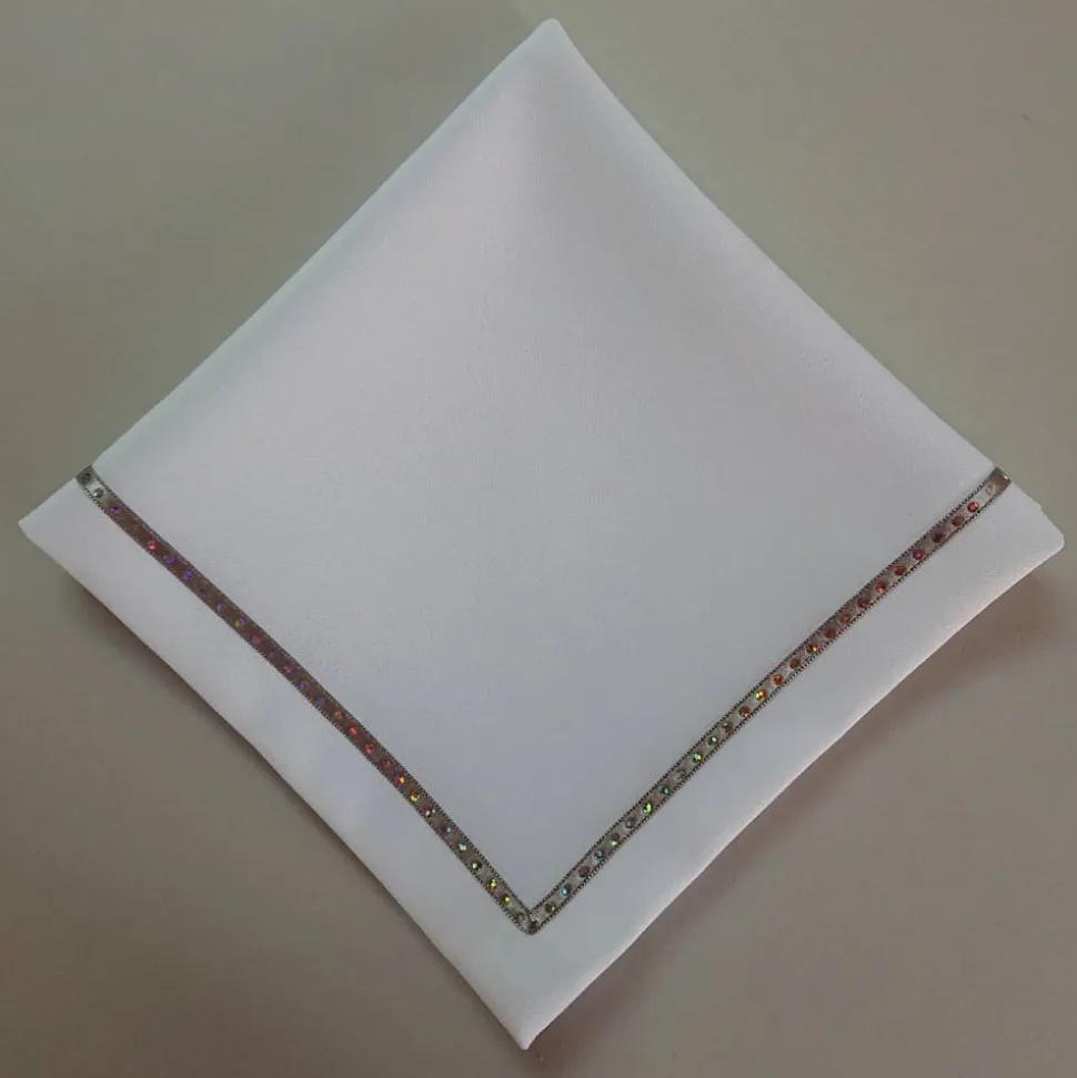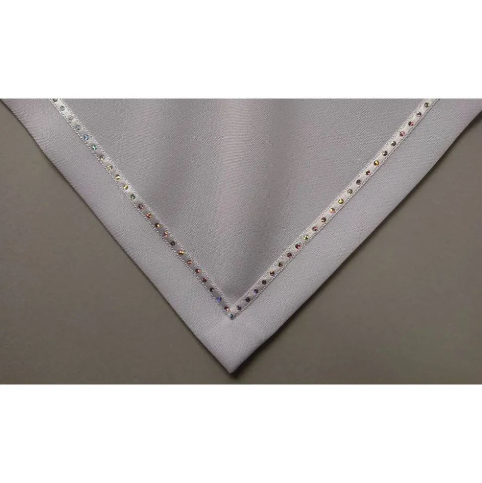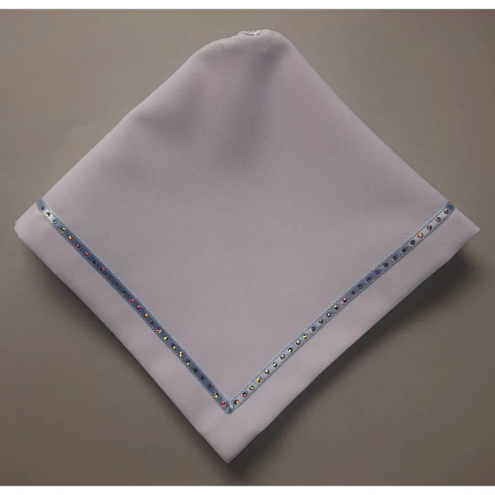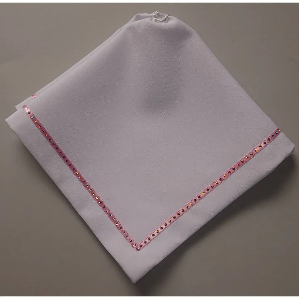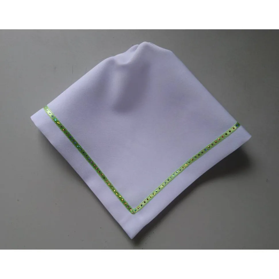 – Das Tuch ist eckig mit aufgenähtem Band.