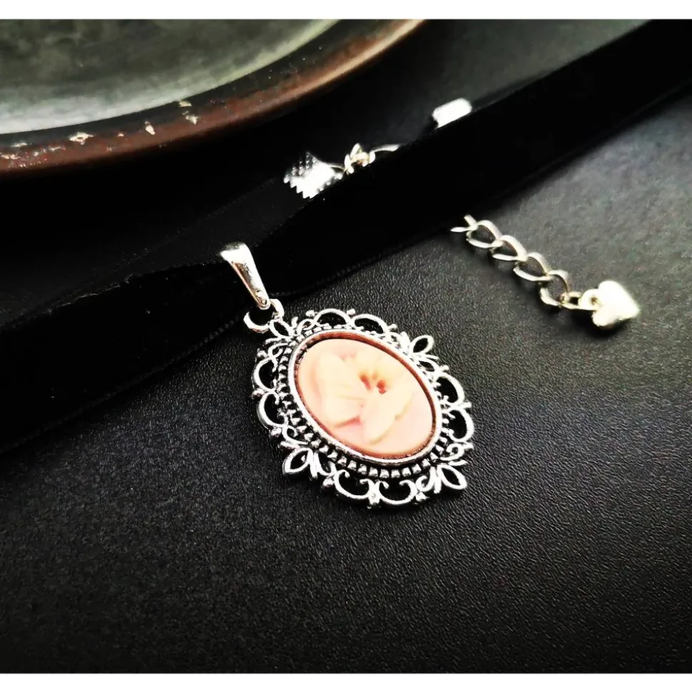 Die Kette ist mit einem zarten Schmetterlingscabochon verziert und besteht aus einem eleganten Samtband mit einem Verlängerungskettchen für die perfekte Passform.