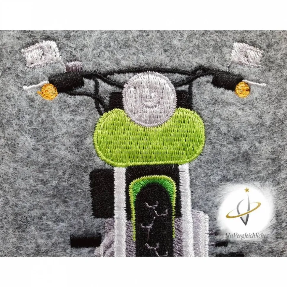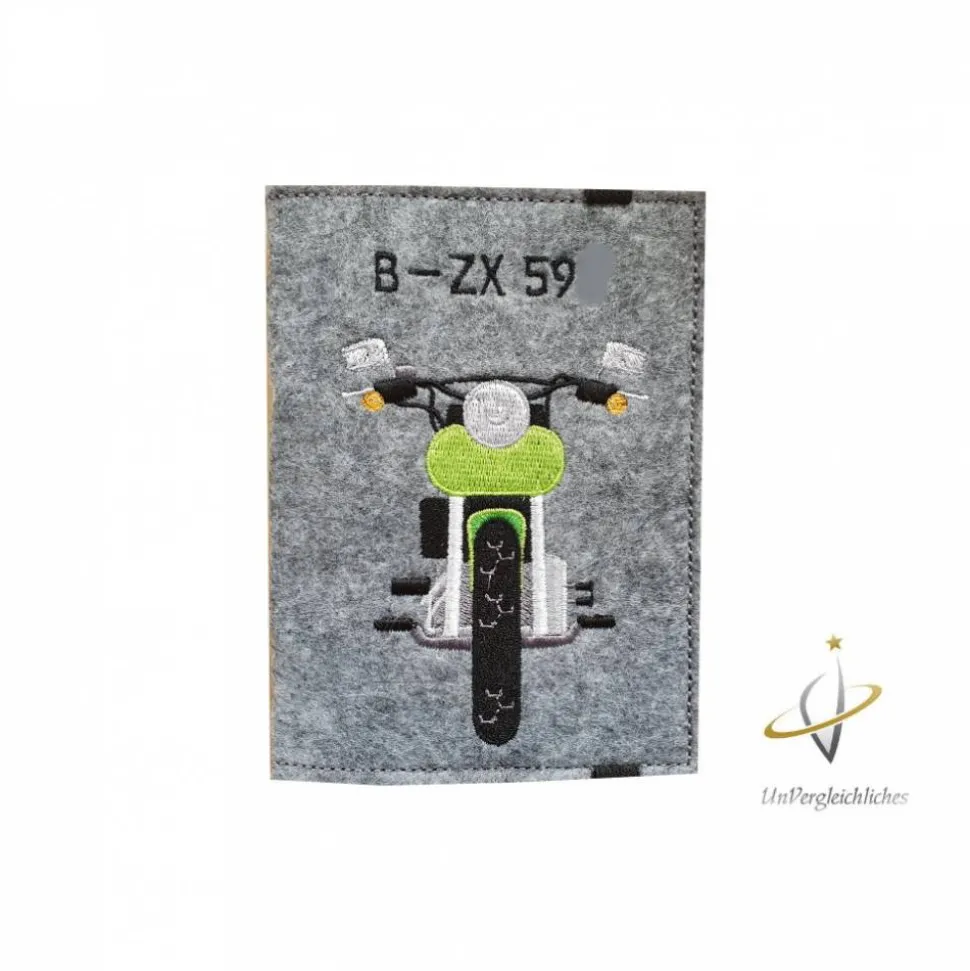 Die Hülle ist aus 2 mm dickem stabilen Filz genäht und mit eurem Wunschkennzeichen bestickt. Ein super individuelles Geschenk für jeden Anlass 😉