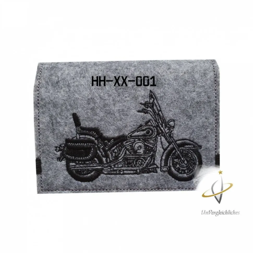Die Hülle ist aus 2 mm dickem stabilen Filz genäht und mit eurem Wunschkennzeichen bestickt. Ein super individuelles Geschenk für jeden Anlass 😉