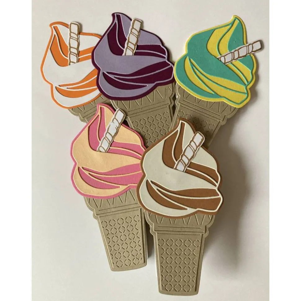 Du erhältst hier bunte Klappkarten als Eis mit Waffel, die liebevoll mit einem Stempel- und Stanzset von Stampin’Up angefertigt wurden. Beim Aufklappen erscheint im Inneren die festliche Botschaft: „Einladung zum Geburtstag“.