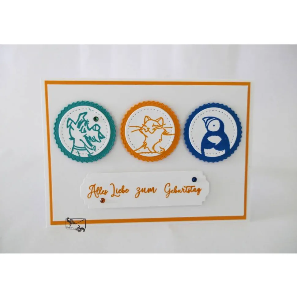 Die drei Etiketten mit Katze, Hund und Papageienvogel sind in den Farben Osterglocke, Bermudablau und Pazifikblau gestempelt und auf weiße Etiketten geklebt.