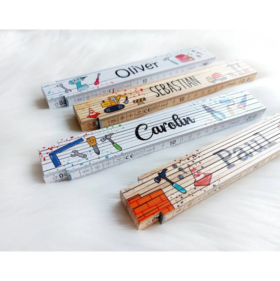 Du erhältst einen 2m Zollstock (natur/weiß) mit einseitigem Aufdruck und deinem Namen – perfekt als Geschenk zum Geburtstag oder für kleine Bastelfans. Wähle dein Lieblingsmotiv und teile uns den gewünschten Namen sowie die bevorzugte Schriftart mit.