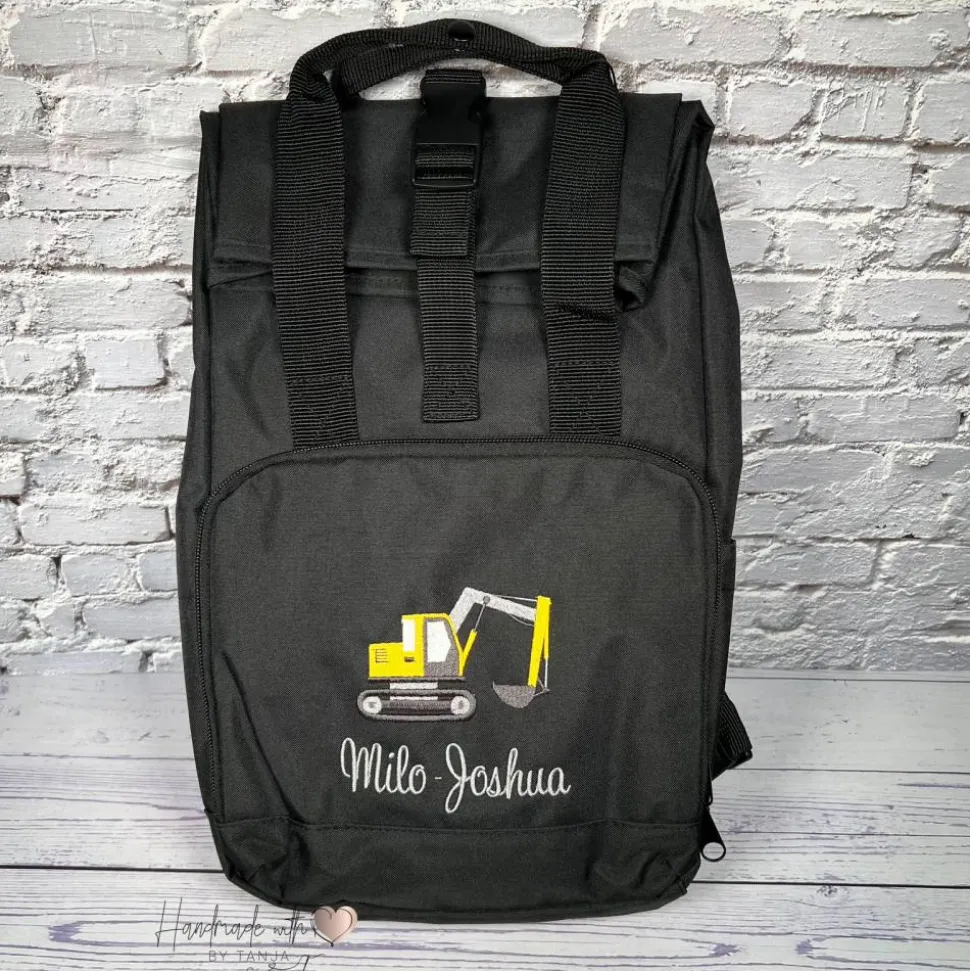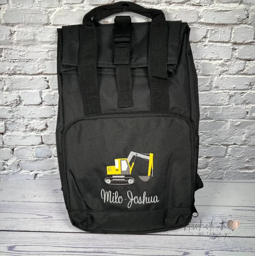 Kinder Rolltop Rucksack mit Bagger & Namen bestickt I personalisierte Kita-Tasche I Kindergartentasche für Jungen