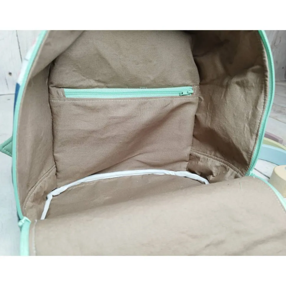 Außen hat reflektierende Paspeln zwischen den unterschiedlichen Motiven eingenäht. So wird man auch im Dunkeln gut gesehen. Mit den 2 leicht zu führenden Reißverschlüssen lässt sich der Rucksack leicht öffnen und verschließen. Mit einer großen Schlaufe lässt sich der Rucksack leicht an einem Haken aufhängen.