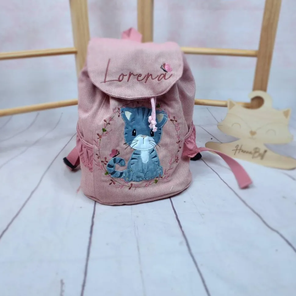 Hier im Beispiel ist es ein Rucksack einem hellen StrukturCanvas in rosa. Gestickt ist eine Katze mit Blumenkranz von Stickherz.Du kannst aber aus vielen verschiedenen Applikationen wählen – schau doch bitte mal in die Bilder 🙂