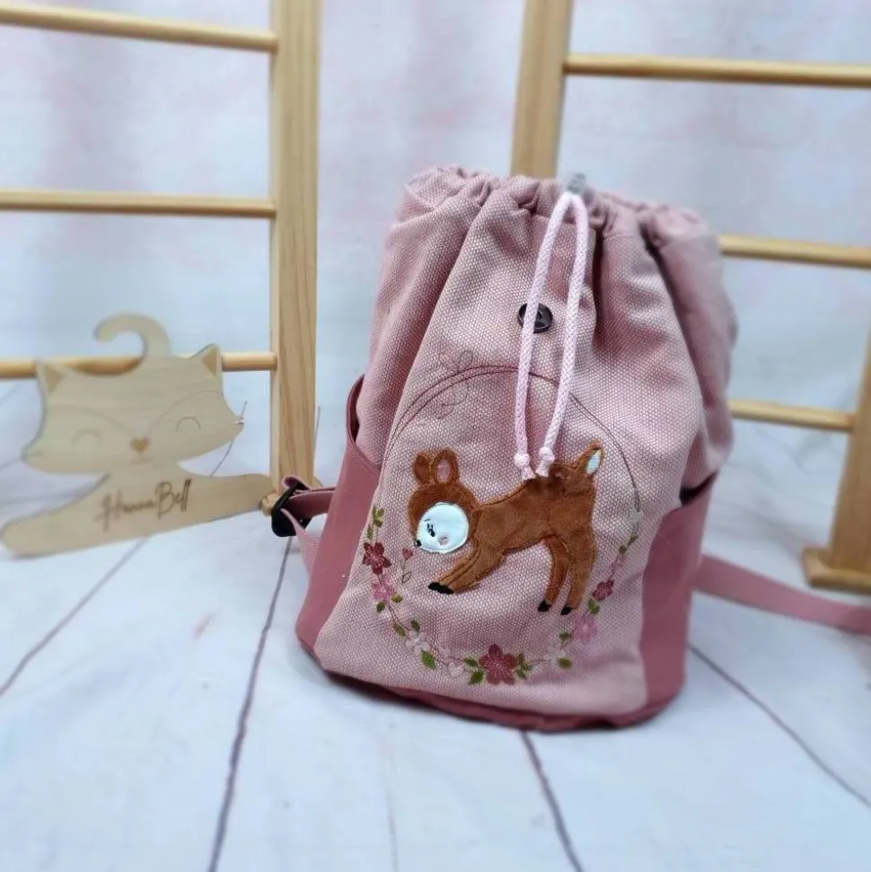 Hier im Beispiel ist es ein Rucksack einem Strukturcanvas in pink kombiniert mit einem UniCanvas in altrosa. Gestickt ist ein Reh im Blütenkranz von Stickherz. Du kannst aber aus vielen verschiedenen Applikationen wählen – schau doch bitte mal in die Bilder 🙂