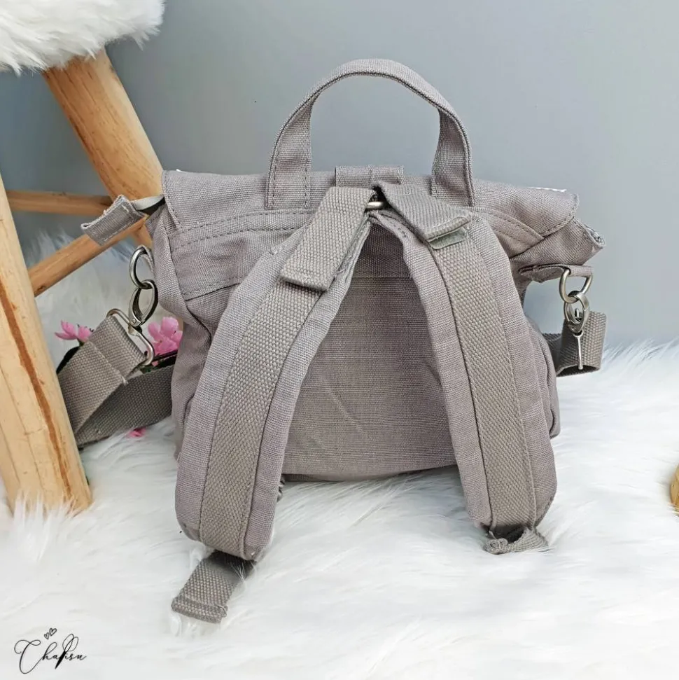 Kindergartenrucksack in Grau, der auch als Umhängetasche oder Henkeltasche verwendet werden kann, somit auch mitwächst.