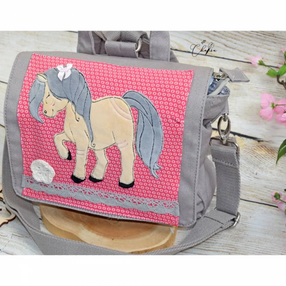 Kindergartenrucksack in Grau, der auch als Umhängetasche oder Henkeltasche verwendet werden kann, somit auch mit wächst.