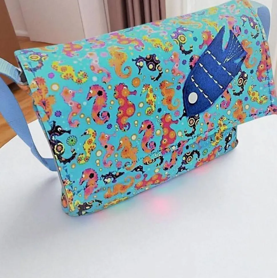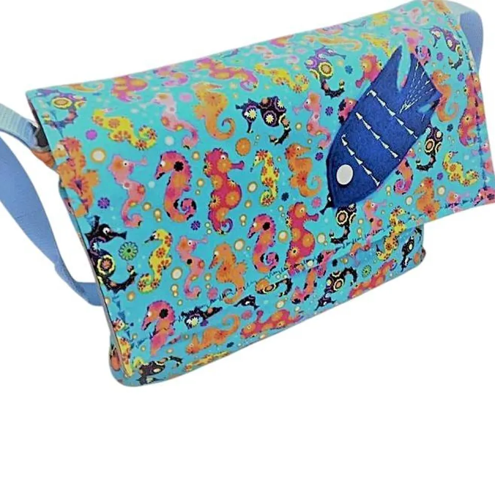 Süße Kindergartentasche mit Fisch-Applikation. Die Tasche hat genügend Stauraum für das Vesper und ein Kuscheltier. Der Umhänge Gurt ist verstellbar. Auch Handtaschen tauglich. Die Tasche ist aufgrund seiner Details vielseitig einsetzbar, ob als Kindergartentasche, Umhängetasche für kleine Damen, es gibt viele Möglichkeiten. Die Tasche wird mit einem Druckknopf verschlossen.