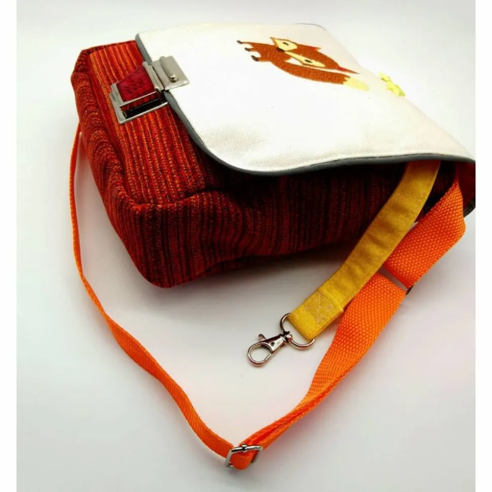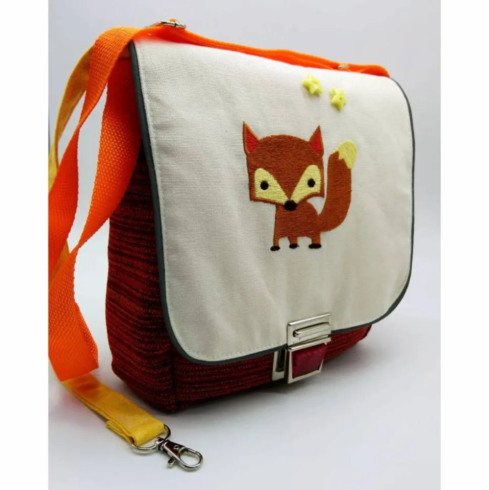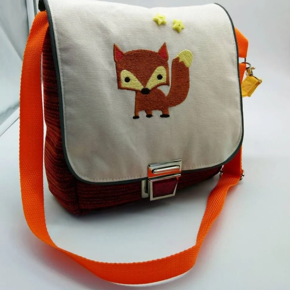 Ein Unikat, genäht aus einem hochwertigen, samtweichen, dicken Bezugstoff, kombiniert mit einem beigefarbenen Leinenstoff, bestickt mit dem kleinen Fuchs, verziert mit 2 Sternen-Knöpfen.