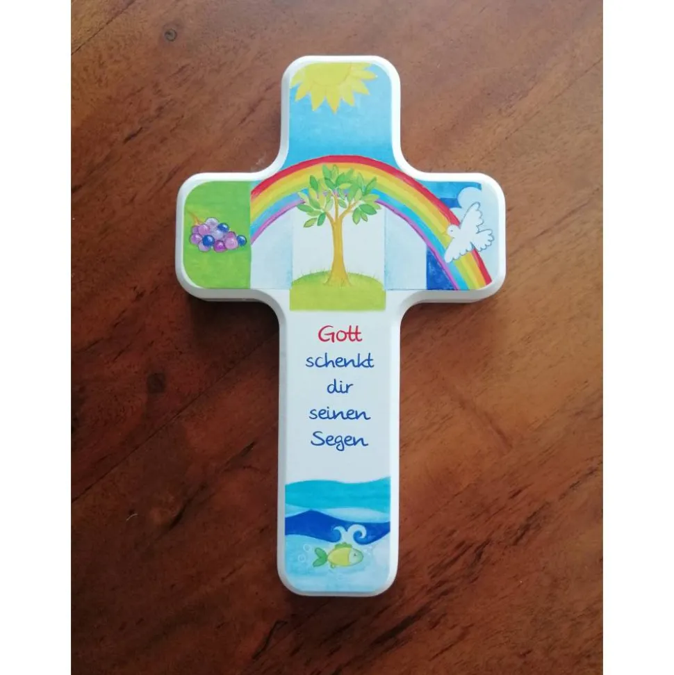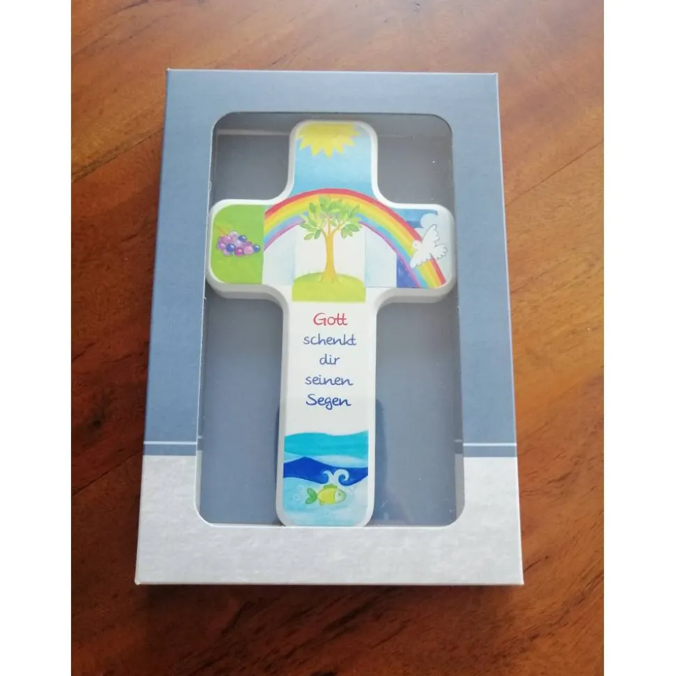 Kinderholzkreuz aus Buche weiß lackiert und farbig bedruckt; Lieferung in Geschenkverpackung