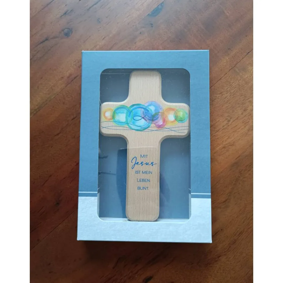 Ein Fisch schwimmt in den Wellen und ist einzigartig durch seine Regenbogenfarben, gleichzeitig symbolisiert dieser die Zugehörigkeit zum Christentum und Gott, während der aufgedruckte Artikeltext unterstreicht: Du bist einzigartig. Dekoliebhaber jeden Alters schätzen die gelungene Kombination aus Illustration und Text auf naturfarbener Buche.