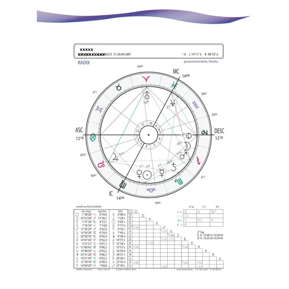* Eine Grafik (Radix) basierend auf den Geburtsdaten des Kindes: Die Konstellation der Planeten wird detailliert dargestellt.