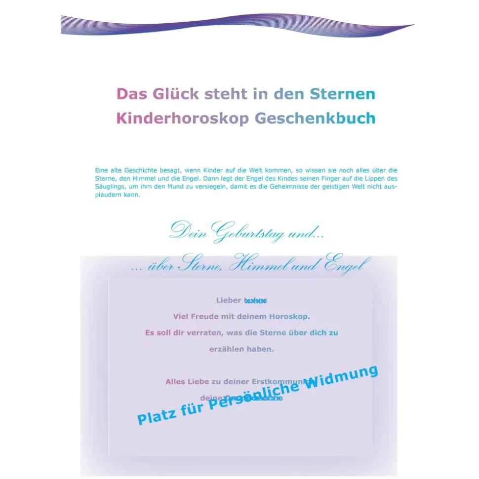 Das Layout ist ähnlich aufgebaut, wie beim Babyhoroskop Geschenkbuch. Die Texte werden altersgemäß angepasst. Es ist sicher spannend für dein Kind zu erkennen, wo die eigenen Stärken, Begabungen, Zielvorstellungen, usw. im Horoskop zu sehen sind. Und die Überraschung ist perfekt, wenn diese astrologischen Erkenntnisse genau der Realität entsprechen.