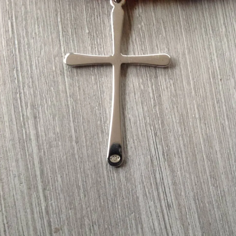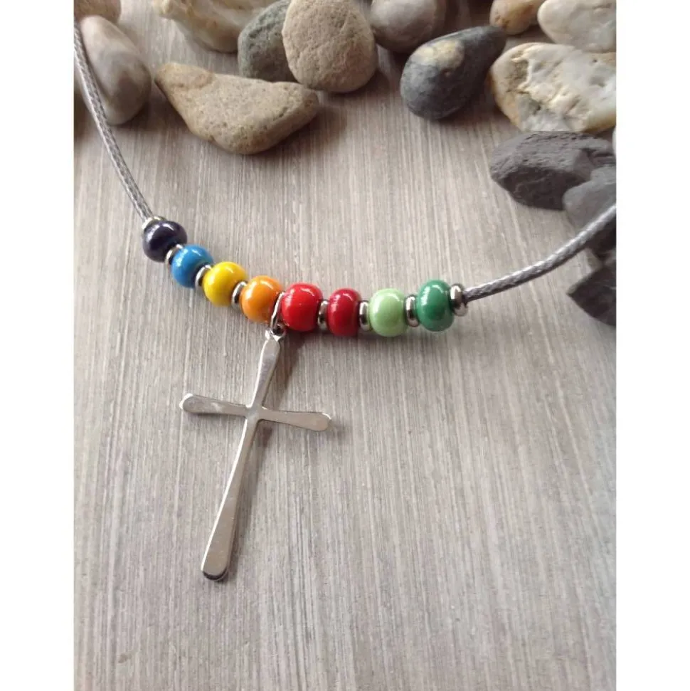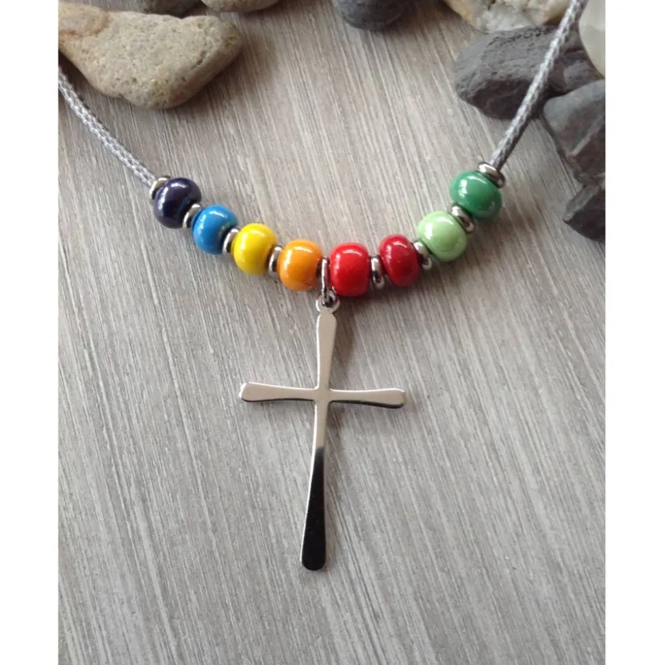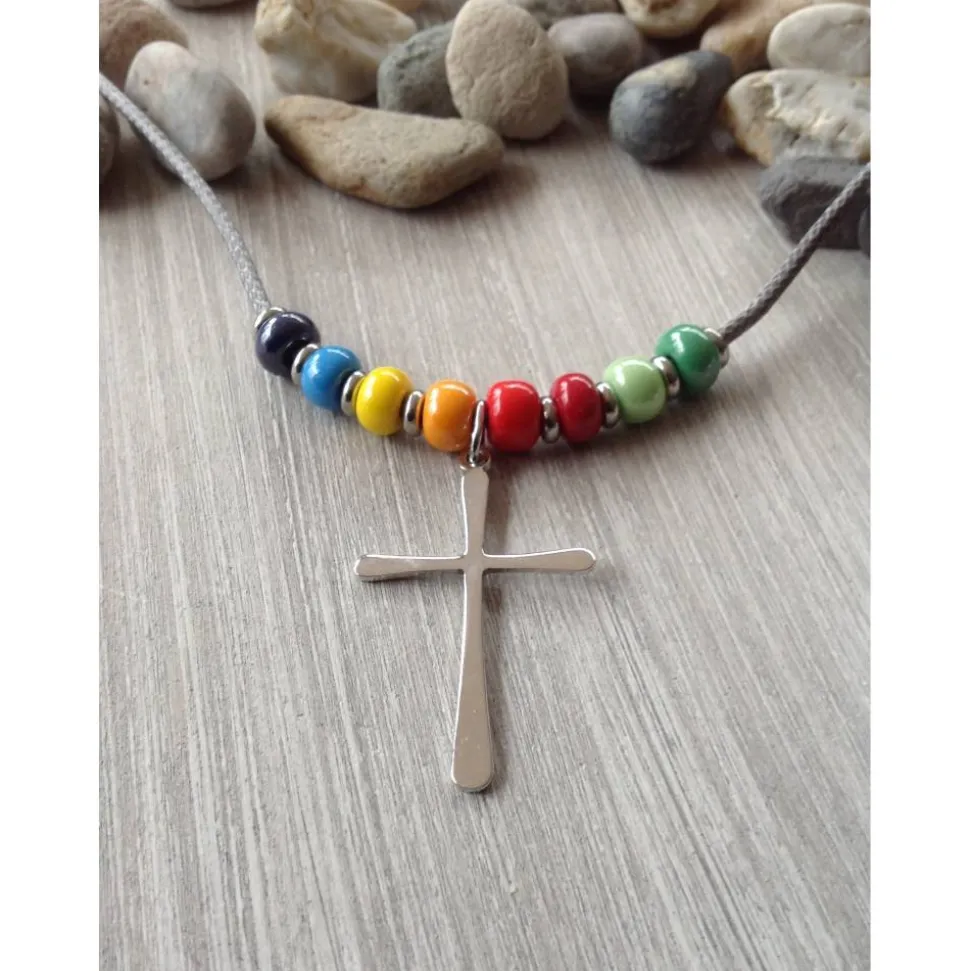 Die Kette ist aus grauer Nylonschnur ( ca 2mm stark ) hergestellt. Die Länge ist durch die Schiebeknoten variabel Verziert ist sie mit bunten Rocailles ( Durchmesser ca 5mm ) Edelstahlperlen und einem schlichten Kreuz ( Höhe 3,5 cm ). Der Kreuzanhänger wurde bereits getragen und kann daher kleine Kratzer aufweisen.