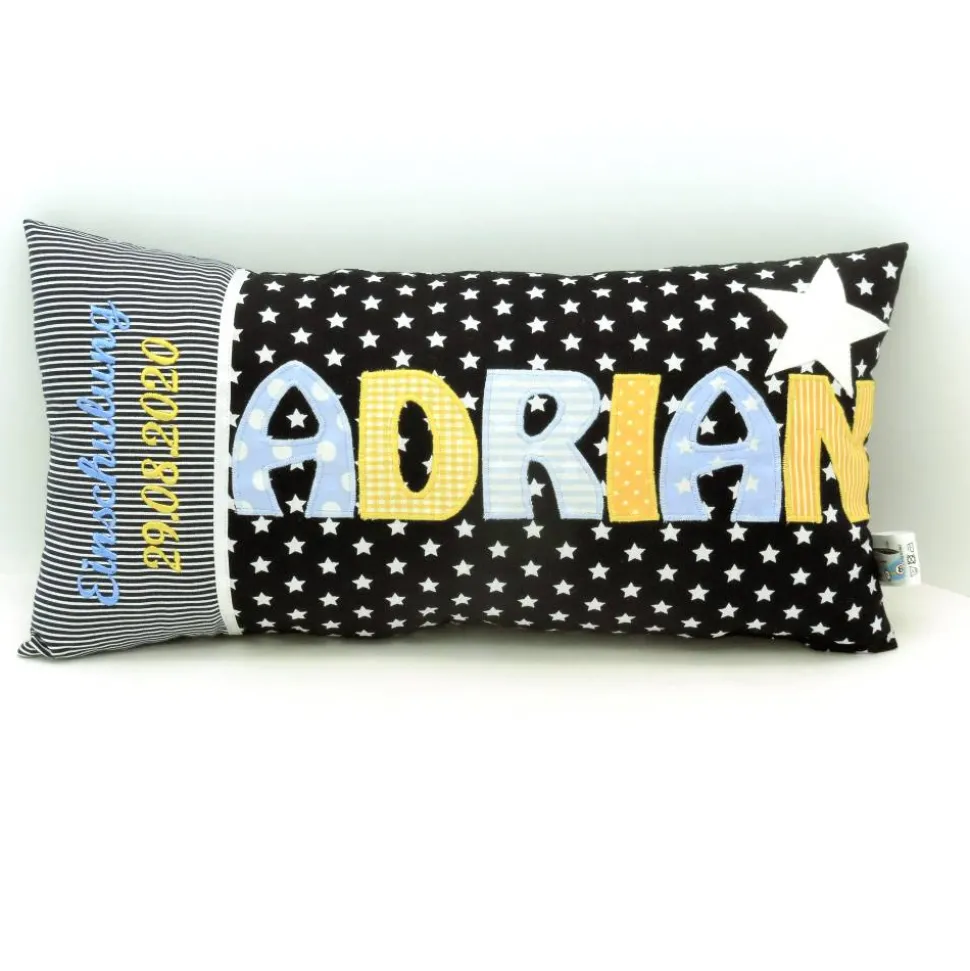Ein personalisiertes Kissen mit Namen (20cm x 40cm) aus weichen Baumwollstoffen in blau/weiß/gelb mit Stern für Jungen und Mädchen – dazu auf der linken Seite das gestickte Wort Einschulung und das Datum.