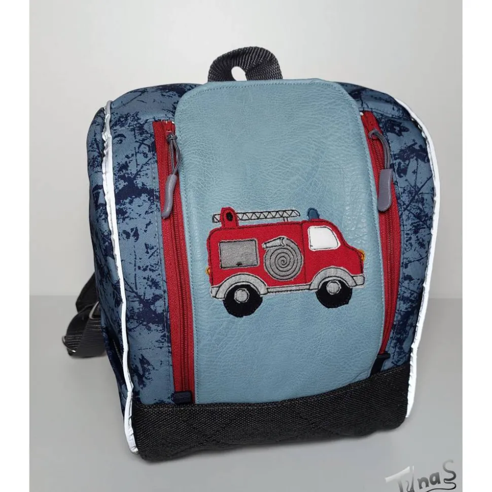 Wie man auf dem letzten Foto sieht, kann ich ein Lederlabel mit dem Namen des Kindes herstellen und auf den Rucksack nähen. Hier für die Fotos habe ich das provisorisch mit dem Namensschild LEON gemacht.