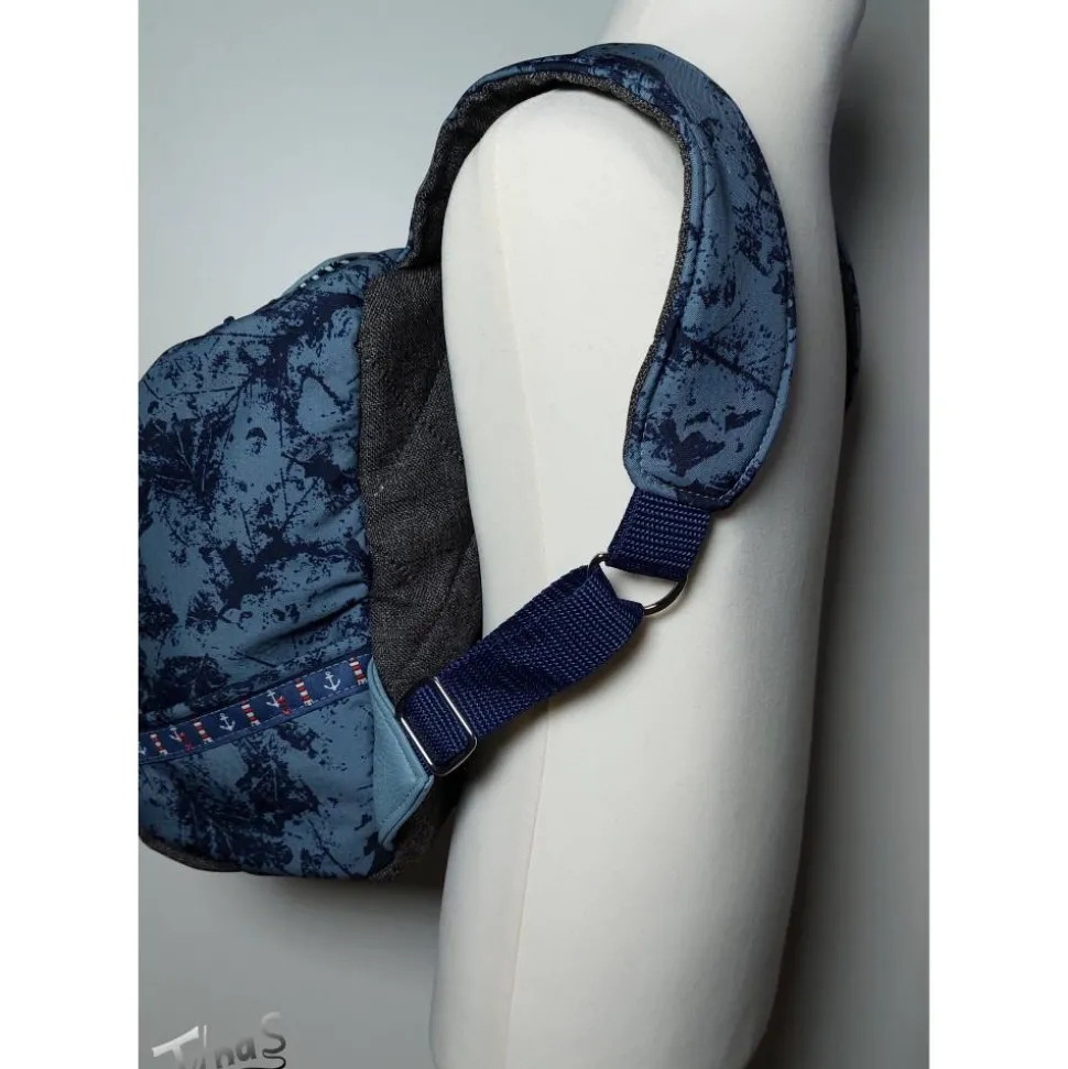 Innen ist eine Innentasche und ein maritimes, gestreiftes Baumwollfutter. Die Gurte sind gepolstert und verstellbar.