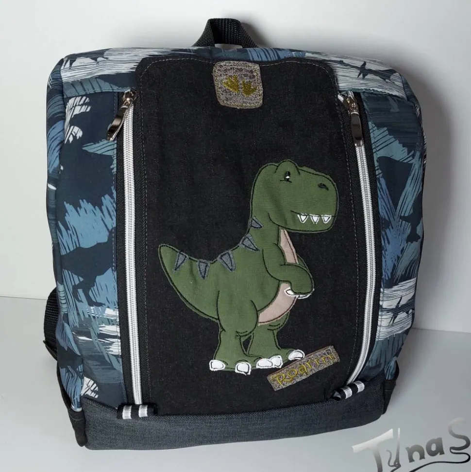 Auf der Vorderseite befindet sich eine Dinosaurier Stickerei und auch der verwendete Softshell ist im Dino Design.
