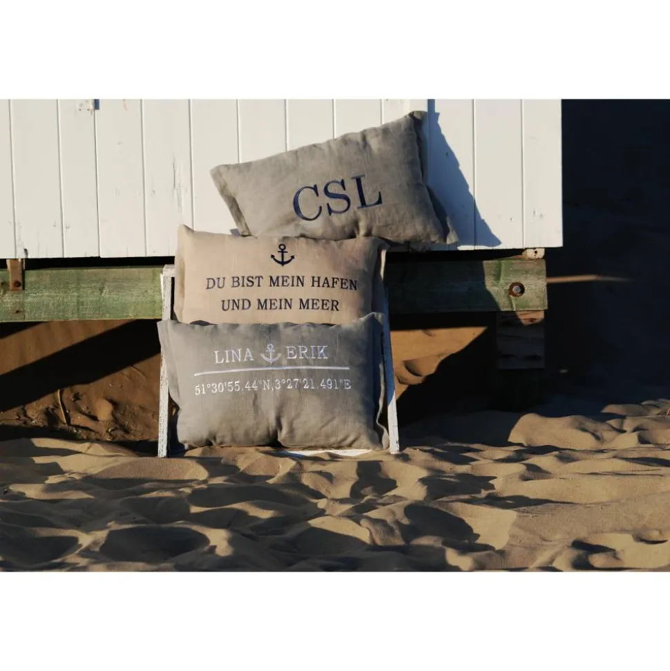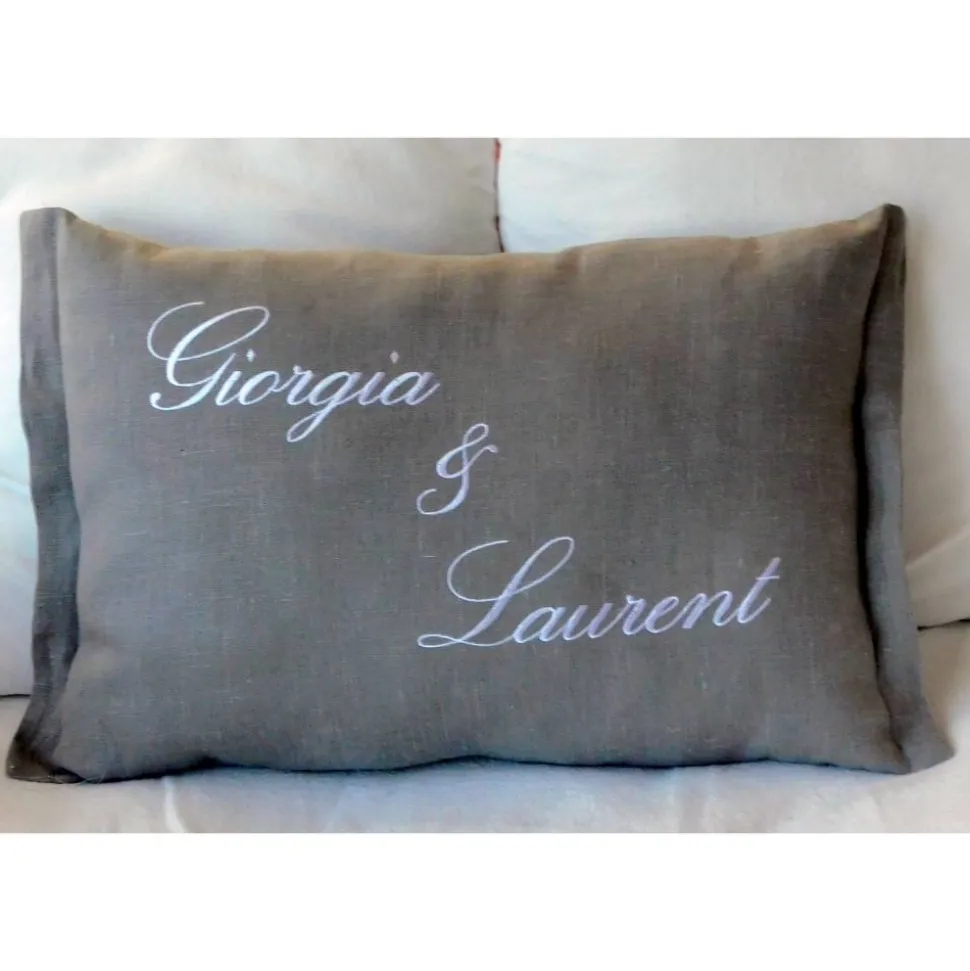 Die Kissen werden mit Ihren Wunschnamen und in Ihrer Wunschfarbe bestickt.
