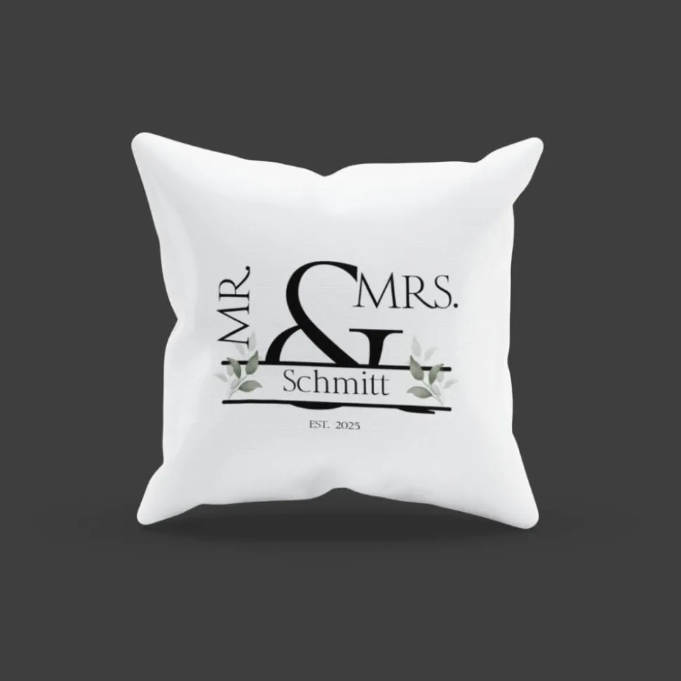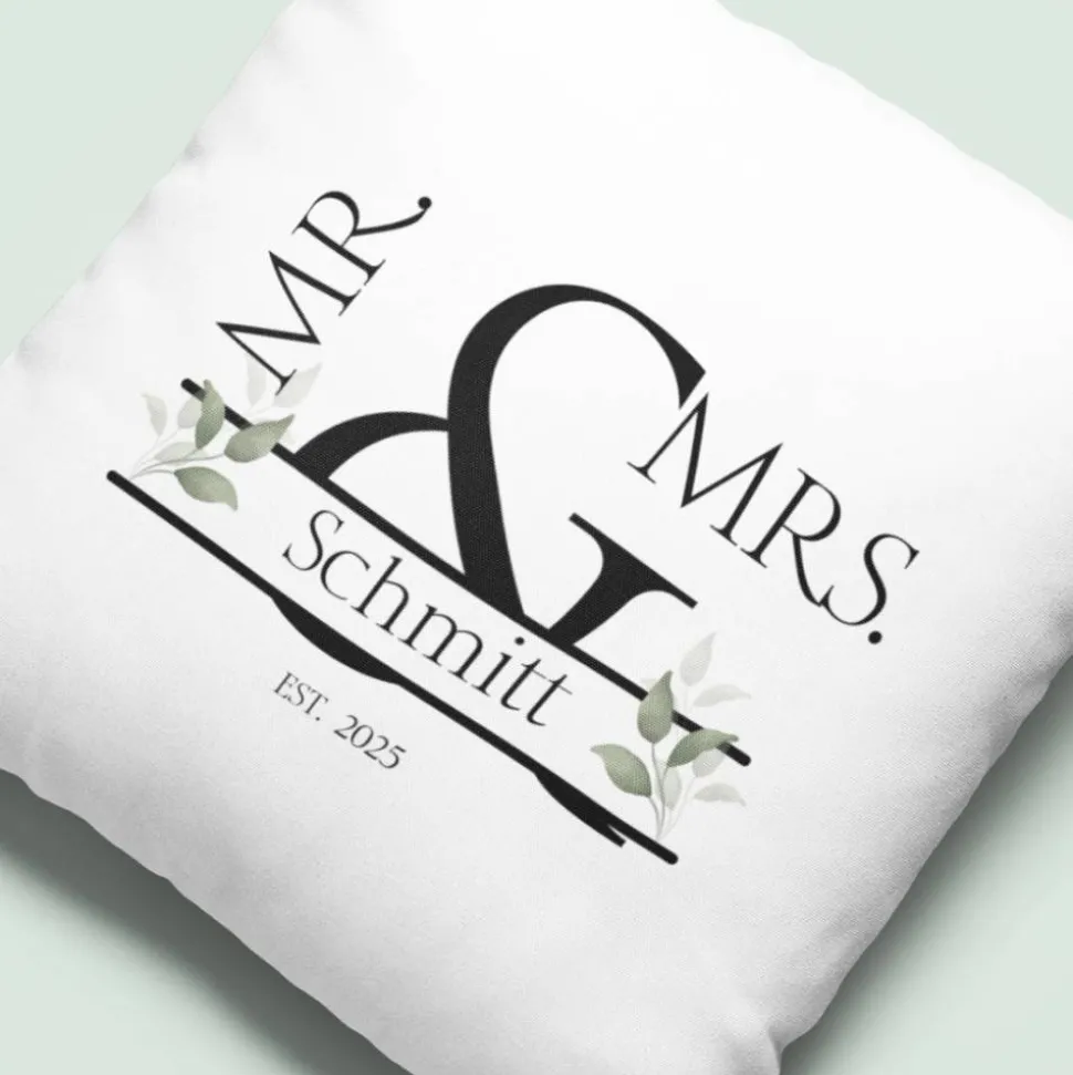 Dieses elegante Hochzeitskissen „Mr & Mrs.“ ist die perfekte Geschenkidee für frisch verheiratete Paare oder Jubiläen. Das edle Design zeigt den Schriftzug Mr & Mrs. in stilvoller Typografie, ergänzt durch den Familiennamen sowie ein Gründungsjahr (Est. 2025 als Beispiel). Zarte Blätterornamente runden das Motiv harmonisch ab. Durch die Personalisierung mit Namen und Datum wird jedes Kissen zu einem ganz besonderen Unikat.