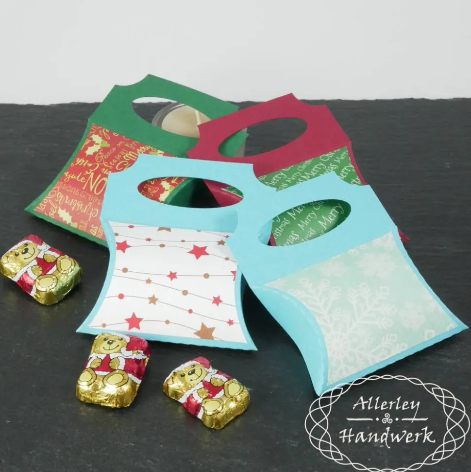 Kissenboxen gibt es inzwischen in sämtlichen Größen und Designs, aber der Henkel ist dann doch etwas Neues. Mit dieser Ergänzung lassen sich die Boxen zum Beispiel zu Nikolaus an befreundete Türen hängen oder zu Weihnachten der Naschkram oder Geldschein hübsch verpackt am Baum drapieren.