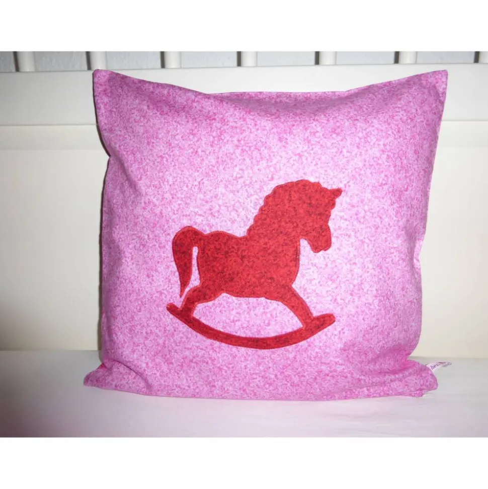 Ein rotes Schaukelpferd wurde hier liebevoll auf die rosa-farbene Kissenhülle appliziert.