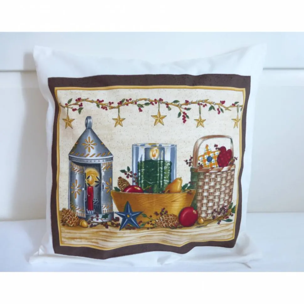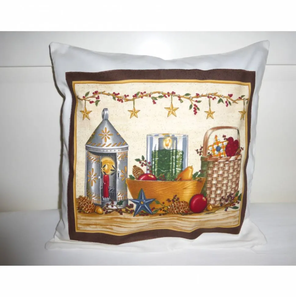 Ein wunderschönes Panel mit Sternen, Laternen, Tannenzapfen, Apfel, Birne, Ilex schmückt diese stimmungsvolle Kissenhülle, die liebevoll für die Weihnachtszeit genäht wurde.