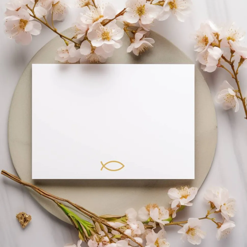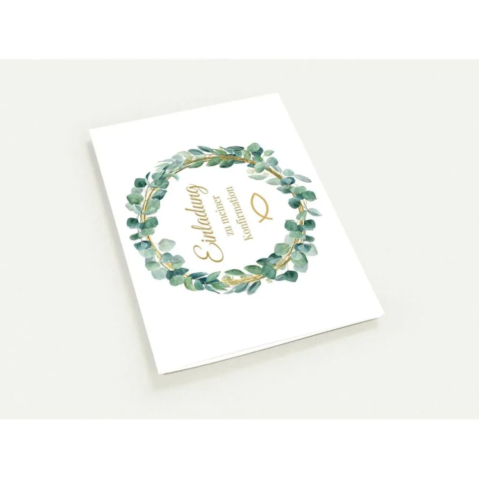 Im Mittelpunkt der Vorderseite steht ein detailreicher Kranz aus grünen Blättern, der für eine frische, harmonische Ausstrahlung sorgt. In der Mitte befindet sich der klar gesetzte Schriftzug „Einladung zu meiner Konfirmation“, der den Anlass direkt und ansprechend kommuniziert. Unterhalb des Textes findet sich ein goldfarbener Fisch, das klassische Symbol des christlichen Glaubens. Auch auf der Rückseite der Einladung zur Konfirmation ist dieses Symbol erneut abgebildet und verleiht dem Design eine stimmige, durchdachte Struktur.