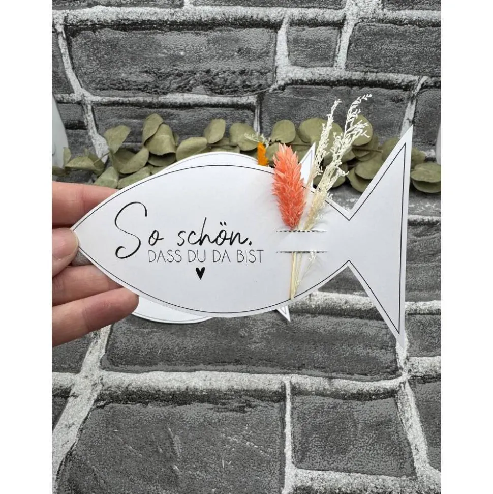 Du kannst zwischen weißem oder Kraftpapier wählen, jeweils mit passendem Spruch und dekorativen Trockenblumen. Jeder Fisch ist ein Unikat und bringt Freude als kleine Geste.
