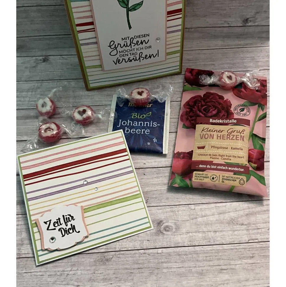 Dann biete ich dir hier dieses Geschenkset. Eine Verpackung in Form einer Tüte, die gefüllt ist mit Kleinigkeiten, für eine „kleine Auszeit“. Außerdem ist eine kleine Grußkarte mit dabei, damit noch ein paar Zeilen nieder geschrieben werden können.