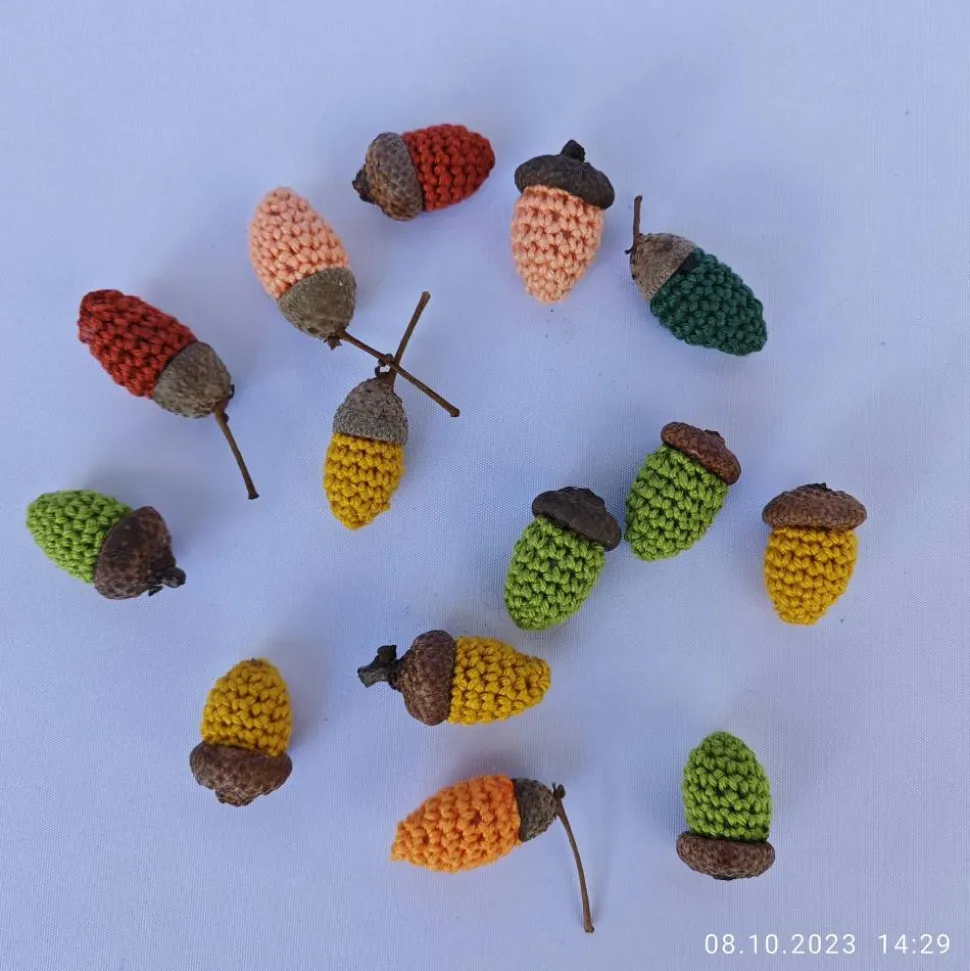 die kleinen Eicheln wurden aus 100 % Baumwolle gehäkelt – mit Bastelwatte gefüllt und in ein in der Natur gesammeltes Eichelhütchen geklebt, jede Eichel ein kleines Unikat