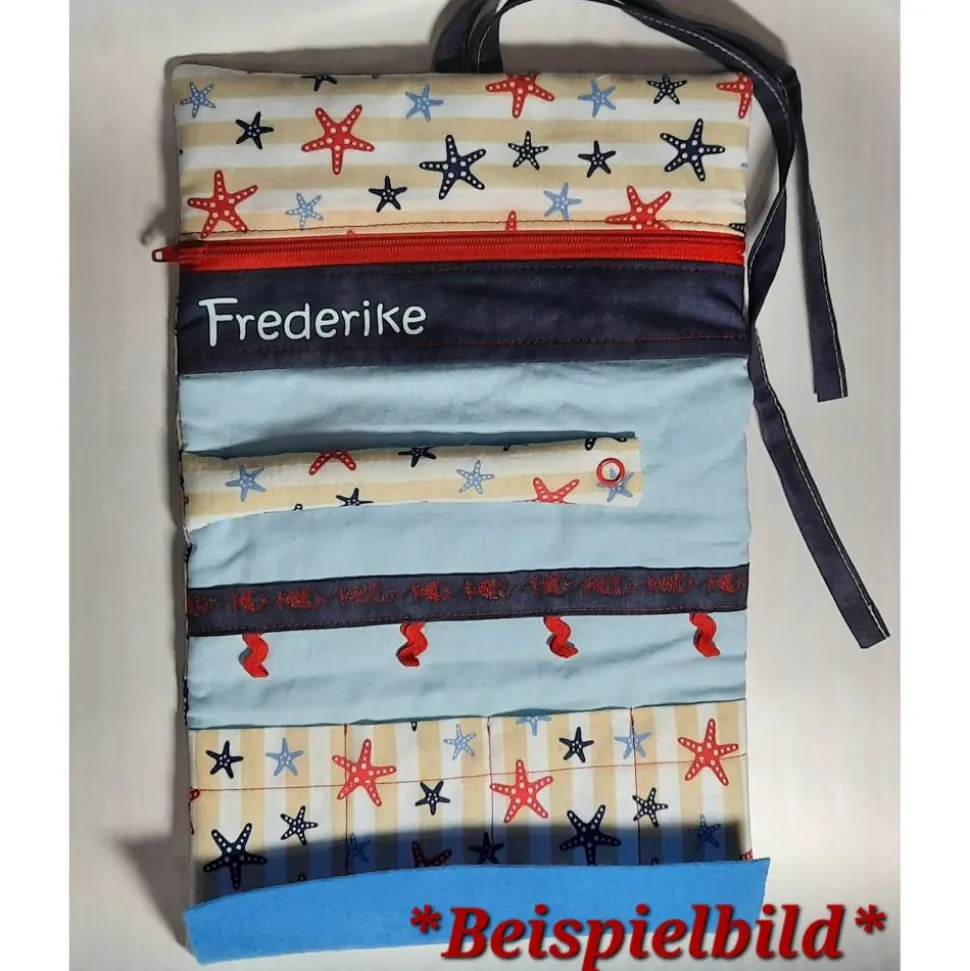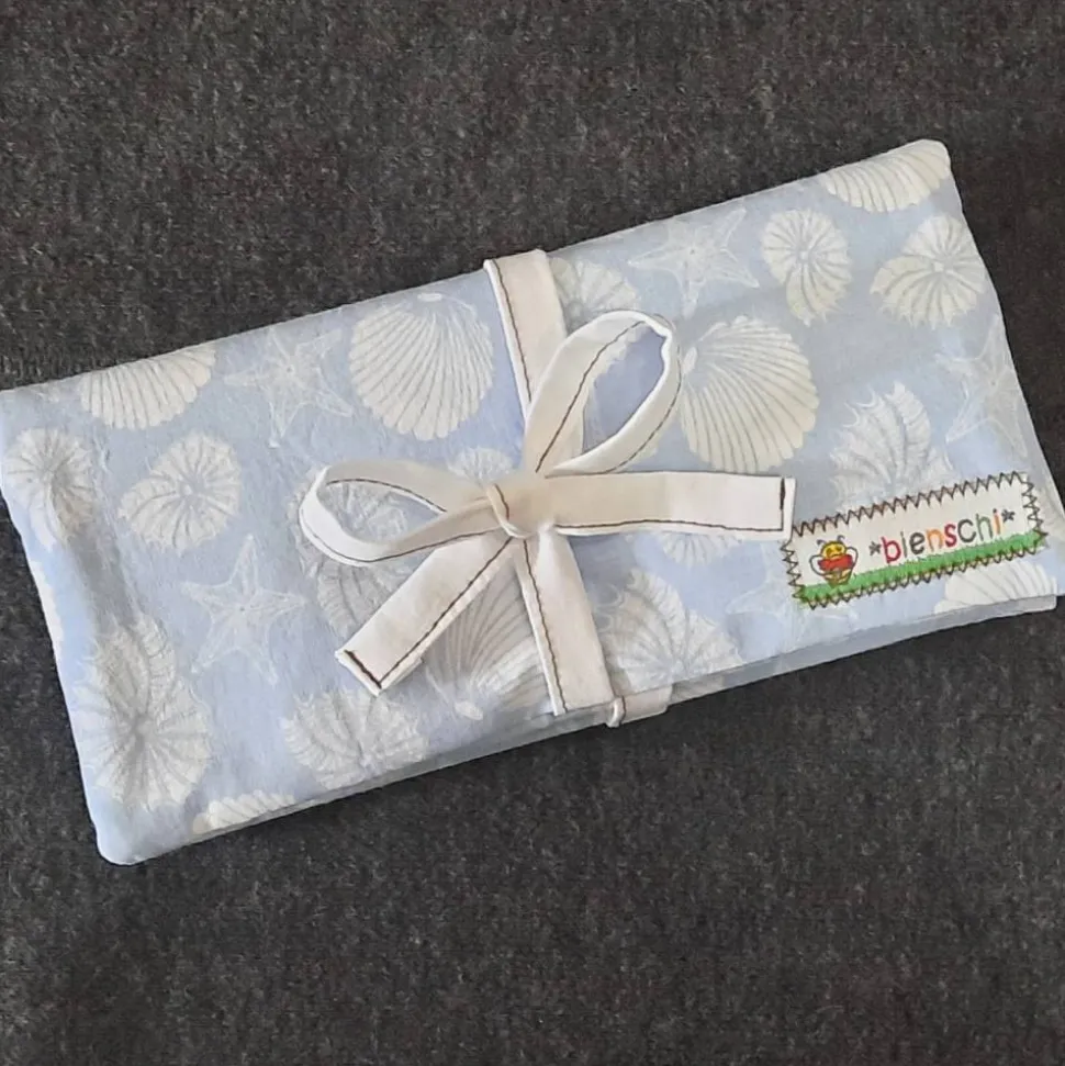 Die angebotene Schmuckrolle ist hellblau mit weißen Muscheln. Innen kombiniert mit dunkelblau und sand. Bändchen in weiß, braune Kontrastnähte.
