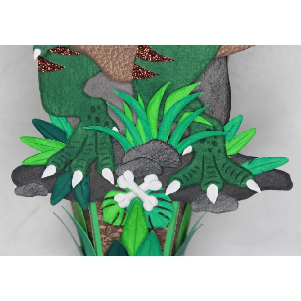 Der Dinosaurier „T-Rex“ ist wahlweise aus grünem oder braunem Fotokarton gearbeitet, einzelne Elemente aus Karton in Lederoptik und braunem Glitterkarton setzen zusätzliche Highlights. „T-Rex“ steht auf einem Felsplateau, umgeben von tropischen Pflanzen, Palmen und Knochen, während im Hintergrund ein aktiver Vulkan die Urzeitkulisse vervollständigt.