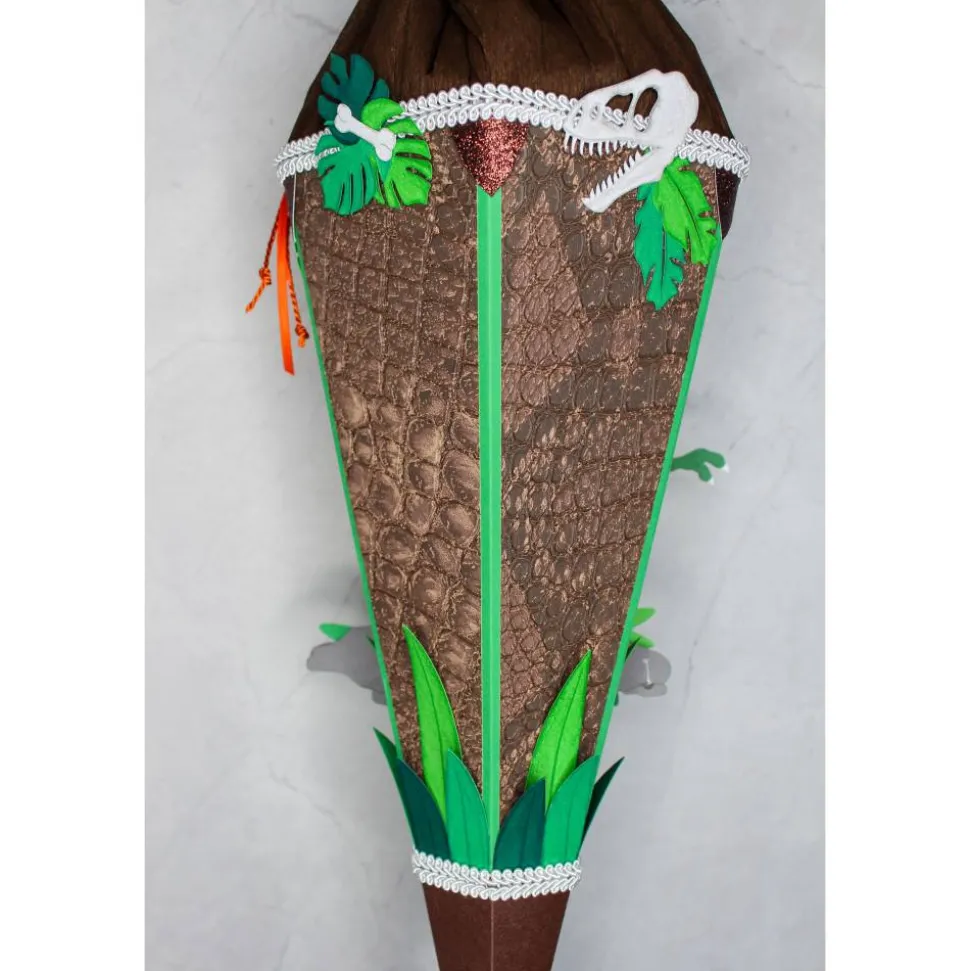 Die Schultüte „T-Rex“ ist mit viel Liebe zum Detail aus hochwertigen Materialien gefertigt und wird in 2 Farbvarianten, Braun und Grün, angeboten.