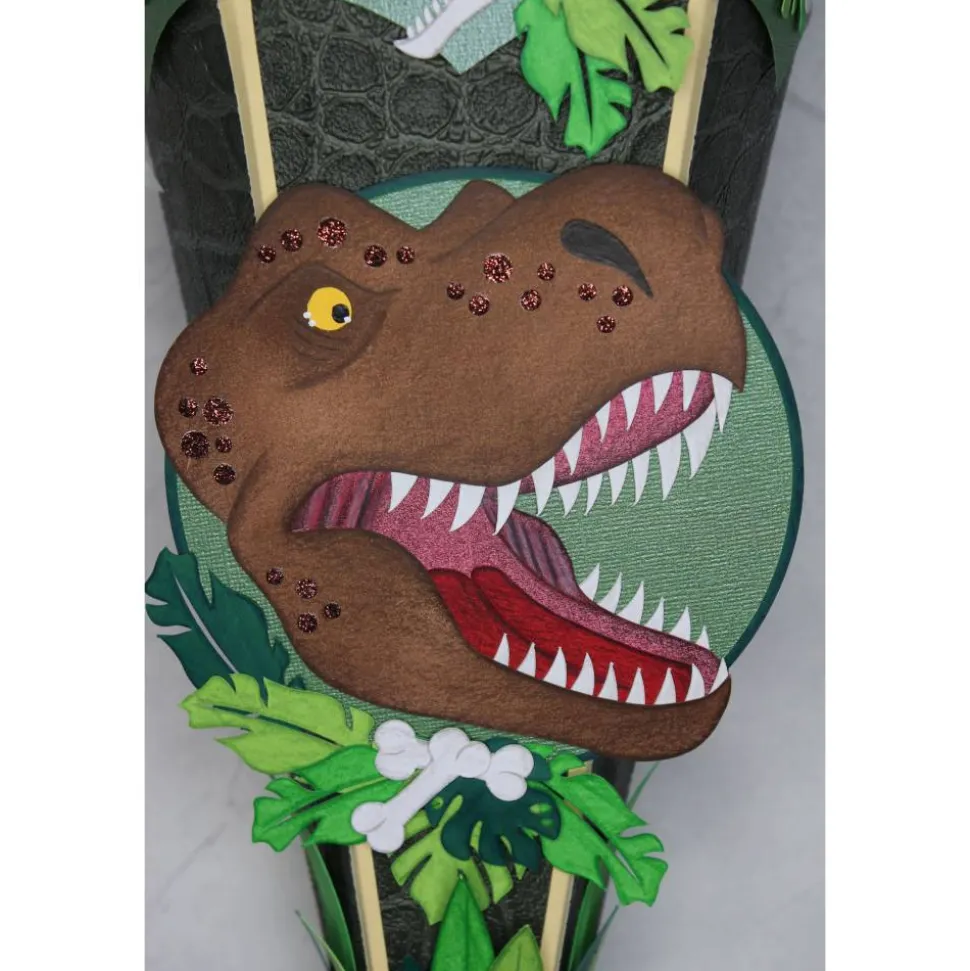 Der Dinosaurierkopf „T-Rex“ ist aus braunem Fotokarton gearbeitet, einzelne Elemente aus braunem Glitterkarton setzen zusätzliche Highlights, er bildet das Hauptmotiv auf der Schultüte.