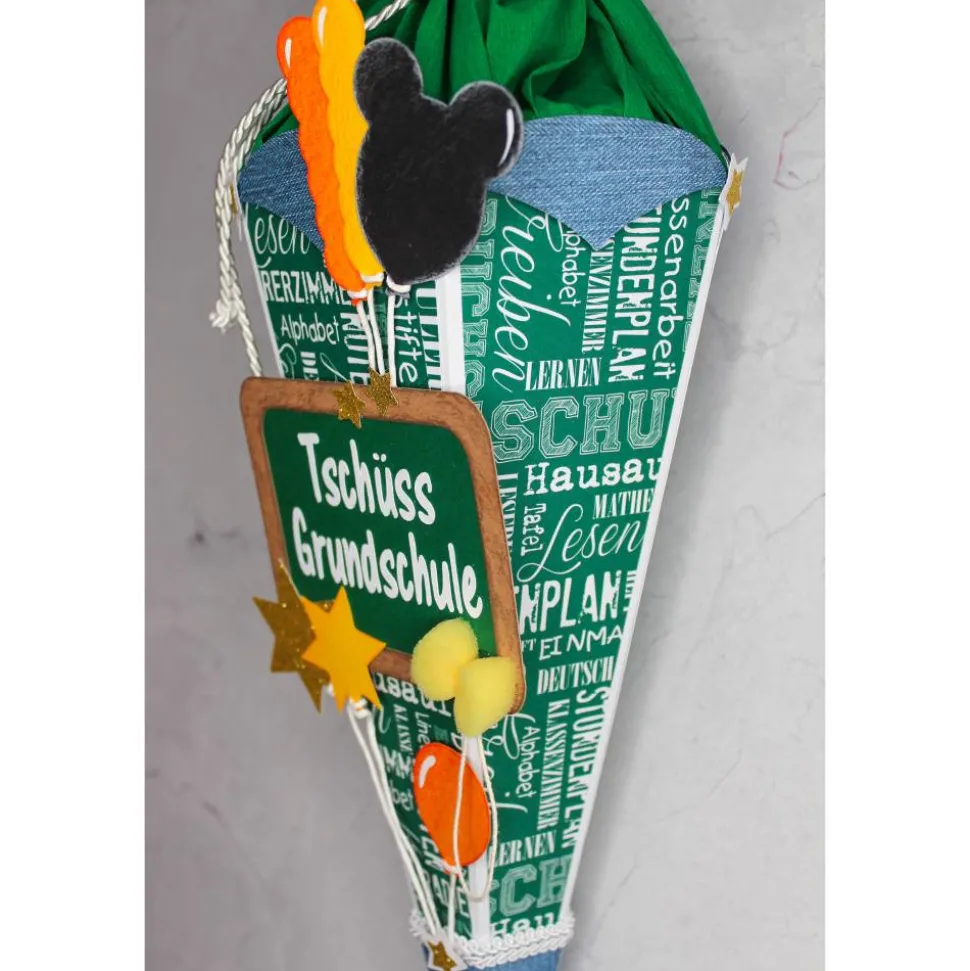 Die Schultafel mit dem Text „Tschüss Grundschule“ bildet das Hauptmotiv und ist mit einem kleinen Schwämmchen verziert. Je nach Modell ist die Tafel in schwarz oder grün gefertigt.