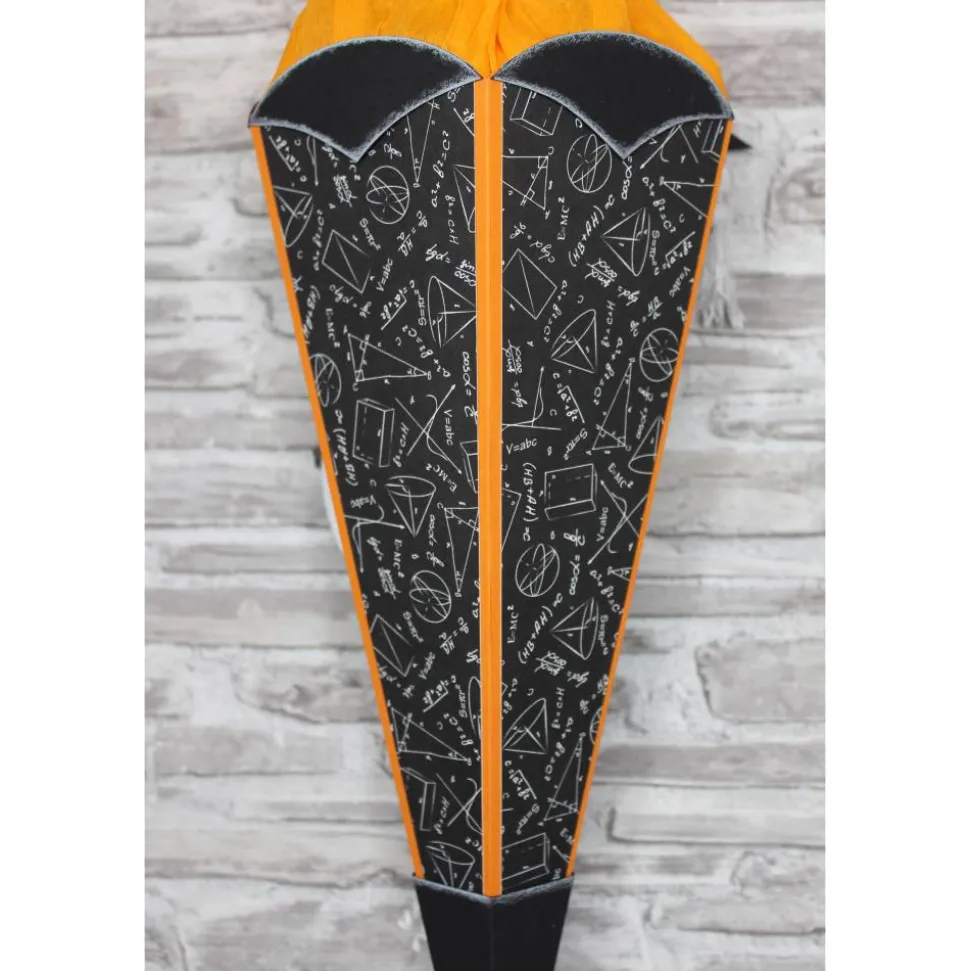 Der 5-eckige Rohling ist aus orangefarbenem Fotokarton gefertigt. Ein Motivkarton mit mathematischen Formeln, verziert alle 5 Seiten des Rohlings.