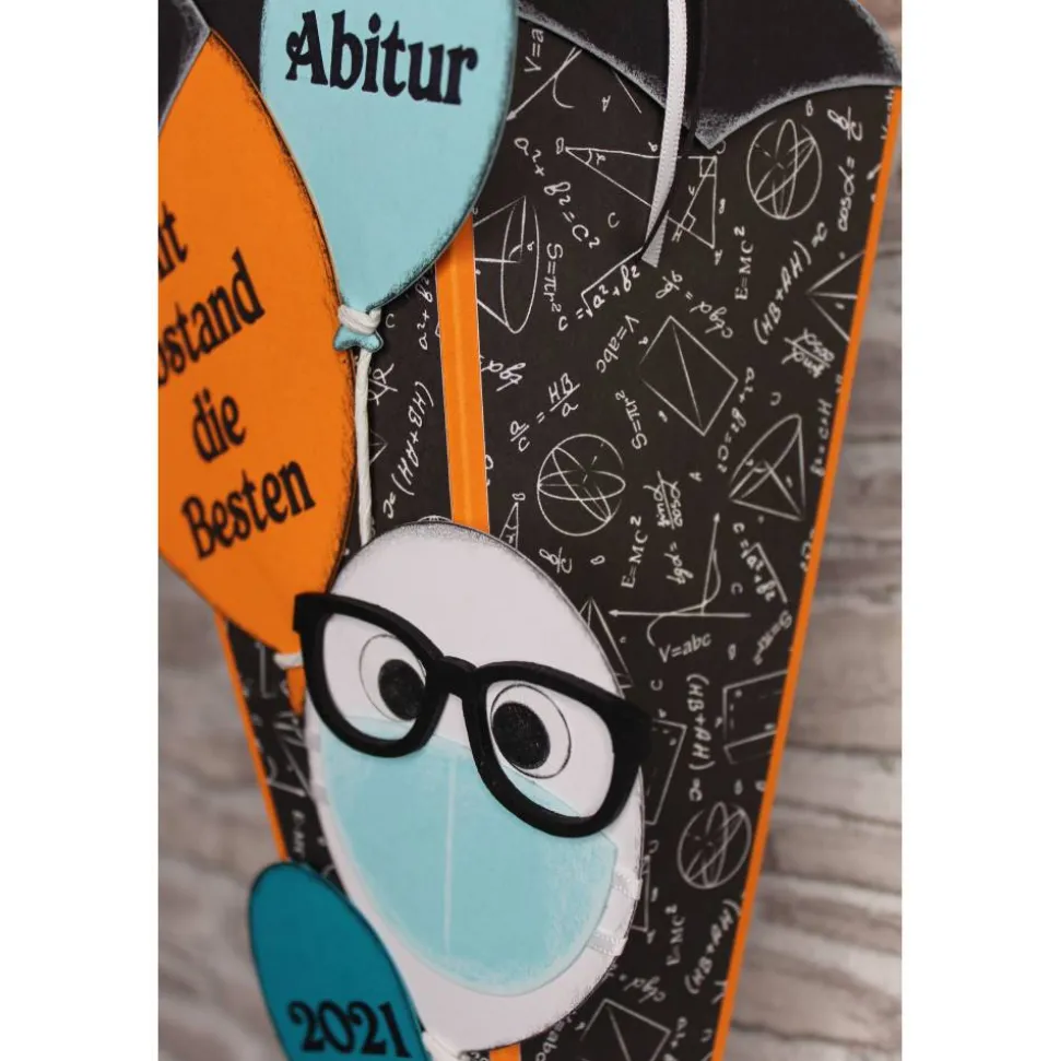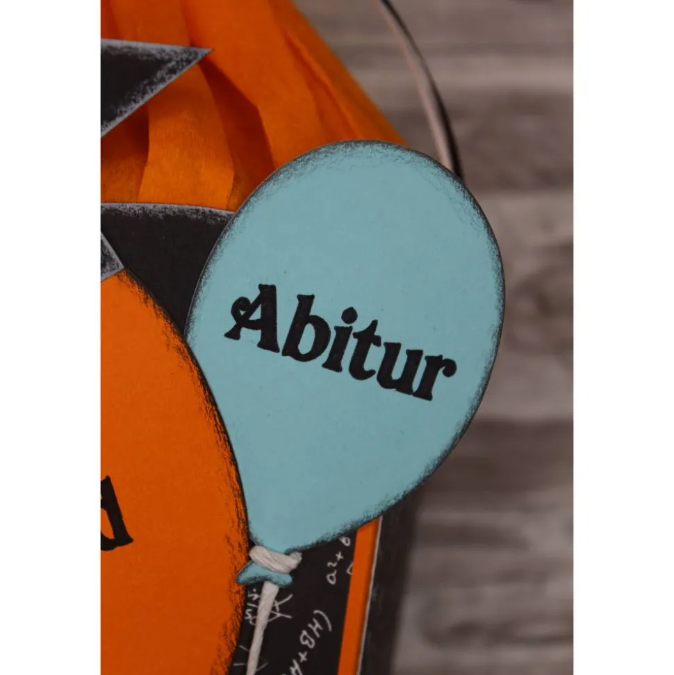 Passend zum Anlass sind die Luftballons mit einem Slogan beschriftet. Die Luftballons sind mit einem weißen Papierdraht an dem Rohling befestigt.