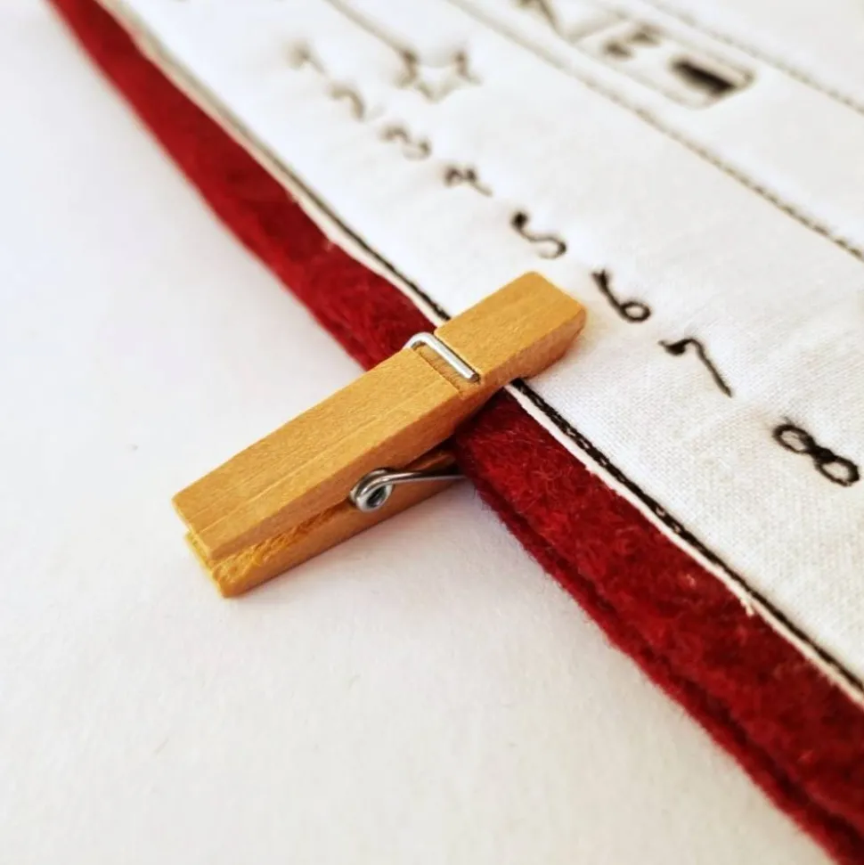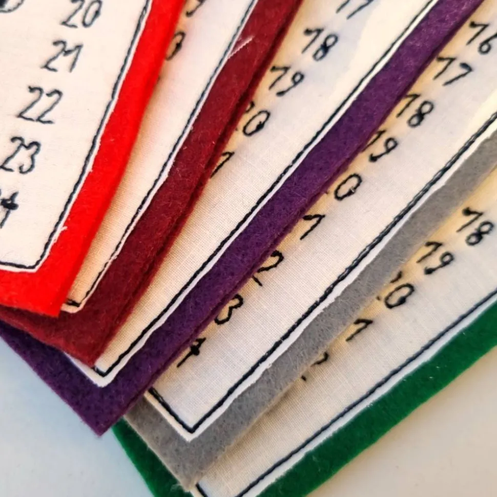 Der Kalender wird aus doppelten Filzplatten, einem Vintage-Baumwollstoff aus den 60er Jahren (Linon-Webart) sowie hochwertigem Stickgarn gefertigt. Die Maße von 19 x 10 cm und die 2 mm Dicke machen ihn kompakt und vielseitig platzierbar. Mit der robusten Baumwollkordel (ca. 60 cm, doppelt gelegt) kannst du ihn einfach aufhängen. Der Countdown bis Weihnachten wird mit einer rustikalen Holzklammer angezeigt und lässt sich jedes Jahr aufs Neue nutzen – für einen nachhaltigen Adventscountdown ohne Kalorien!