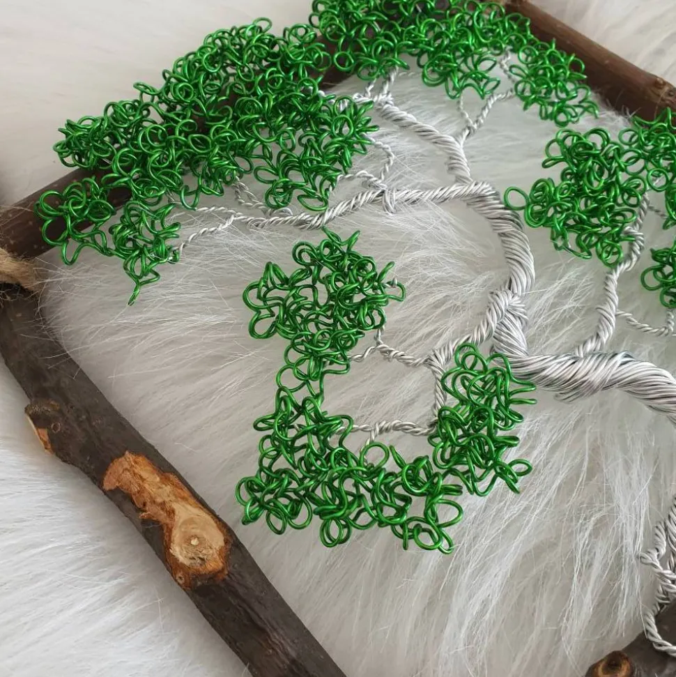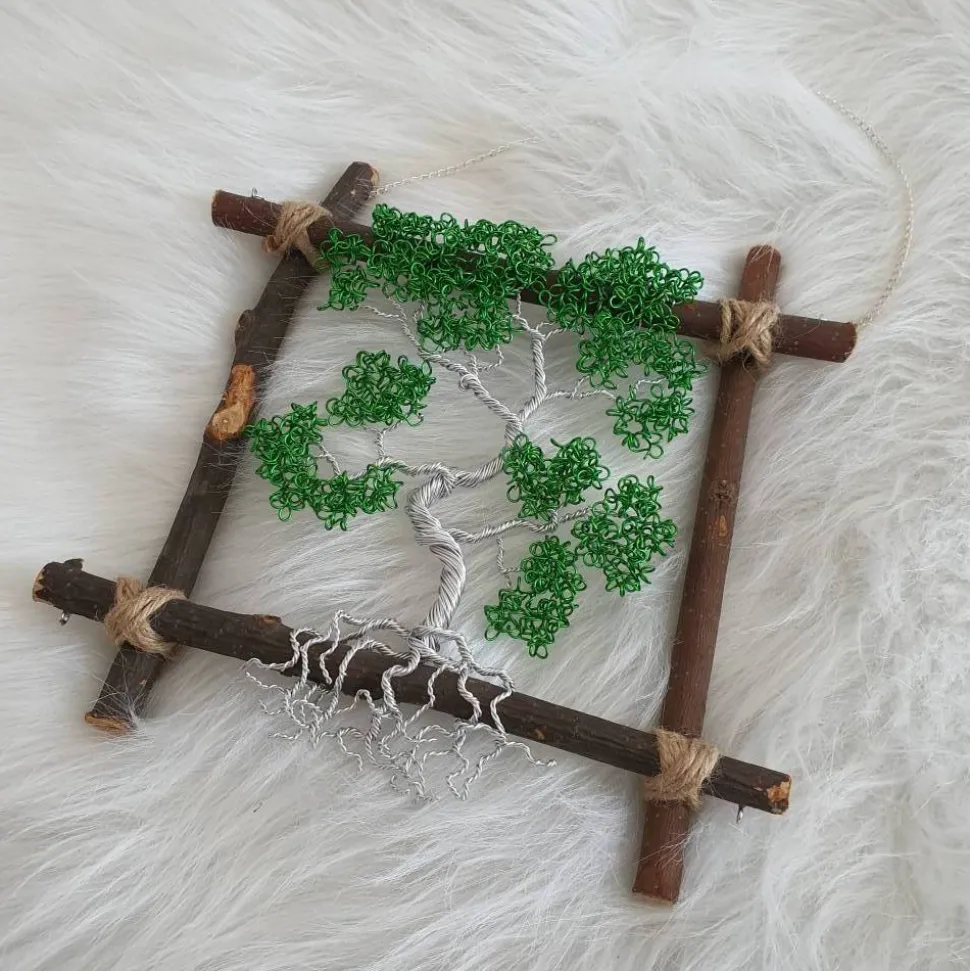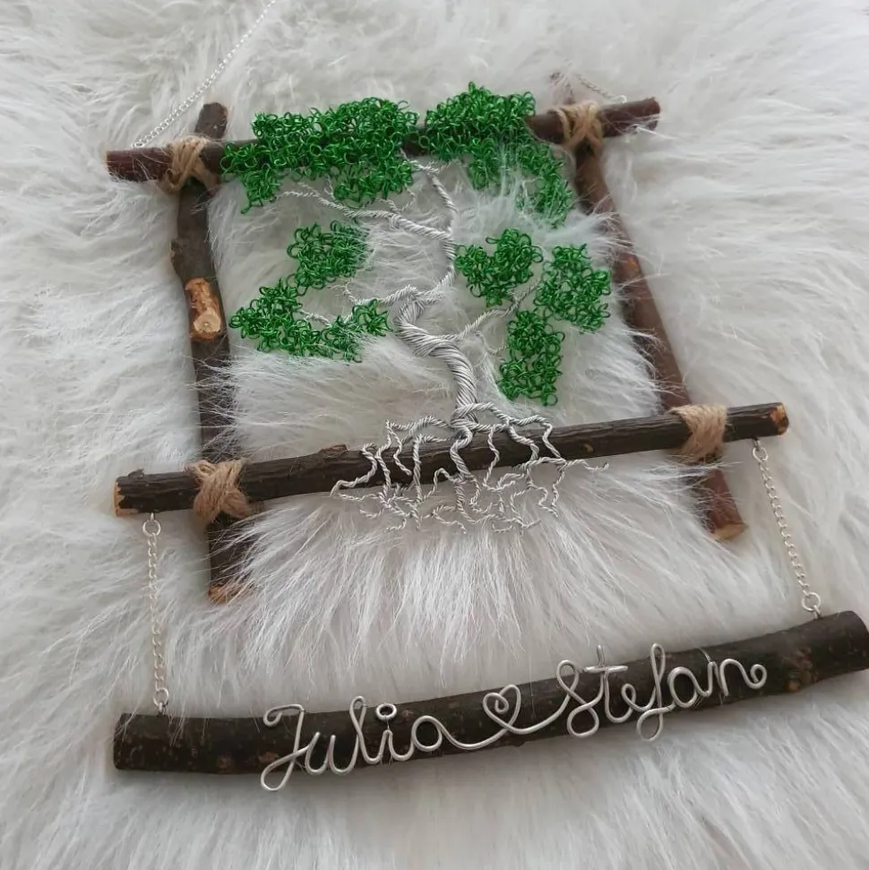 Der Schriftzug kann auch individuell angefertigt werden. Der Drahtbaum wurde nicht an die Äste geklebt, sondern wurde von mir mit dem Draht selbst an den Ästen befestigt.