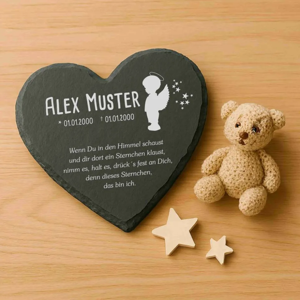 Persönliches Erinnerungsstück: Die langlebige Gravur macht die Schieferplatte zum idealen Grabstein oder Gedenkstein für dein Sternenkind. Deine Wünsche stehen bei uns im Mittelpunkt – wir setzen jeden Auftrag mit viel Herz und Sorgfalt um.