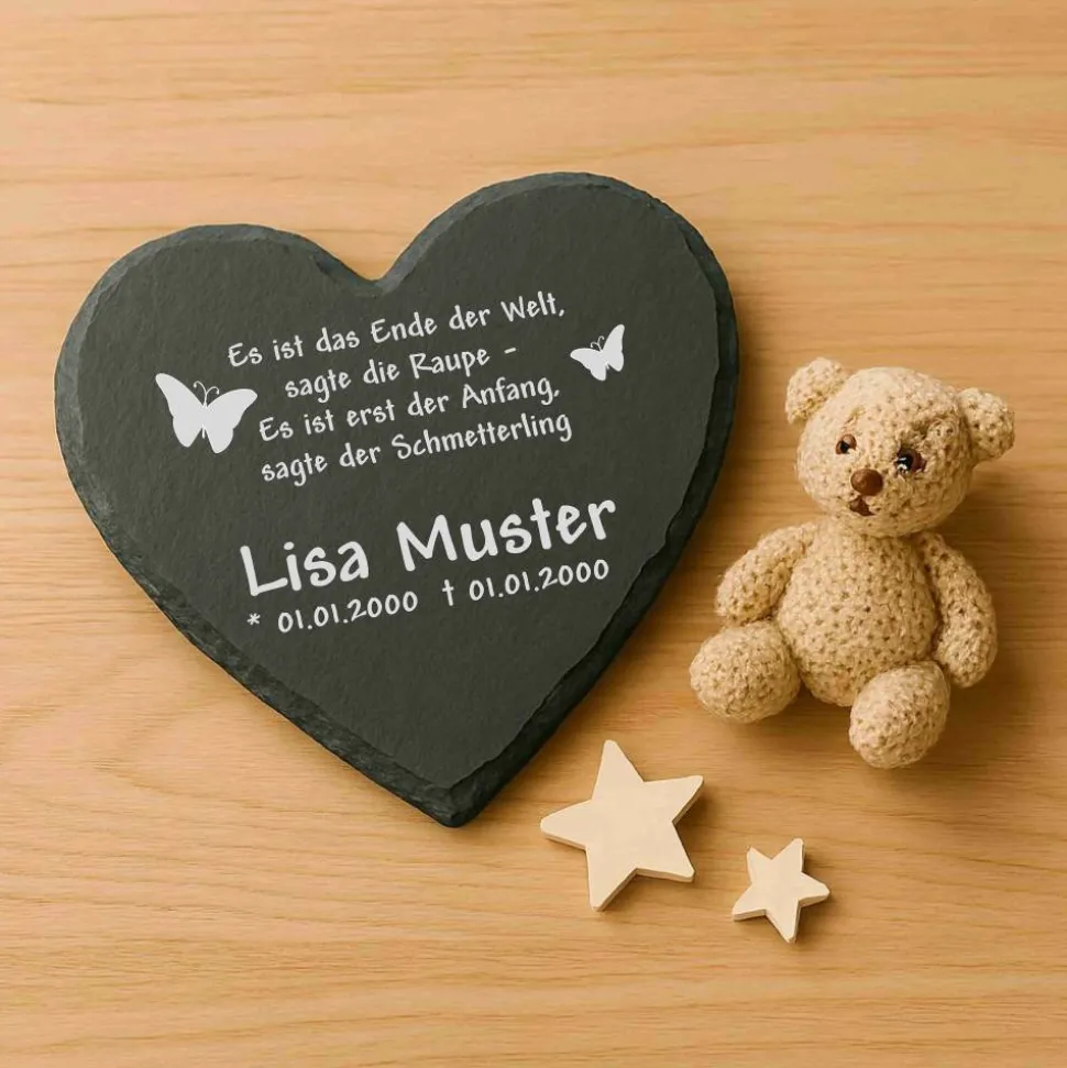 Persönliches Erinnerungsstück: Die langlebige Gravur macht die Schieferplatte zum idealen Grabstein oder Gedenkstein für dein Sternenkind. Deine Wünsche stehen bei uns im Mittelpunkt – wir setzen jeden Auftrag mit viel Herz und Sorgfalt um.