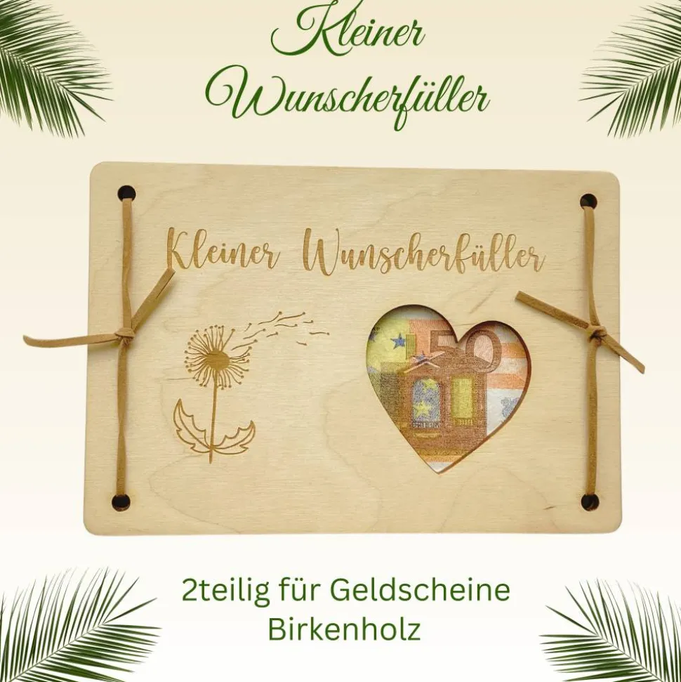 Verschenken Sie Ihre Glückwünsche und Ihr Geldgeschenk mit Stil und Eleganz mit unserer Wunscherfüllerkarte aus Holz. Unsere Geldgeschenkkarte wird mit einem Laser erstellt und per Hand verfeinert. Das abgebildete Geld dient nur zur Veranschaulichung und gehört nicht zum Lieferumfang! Die bei der Lasergravur entstehenden Schmauchspuren und die vom Monitor abweichenden Farbstrukturen können nicht reklamiert werden.