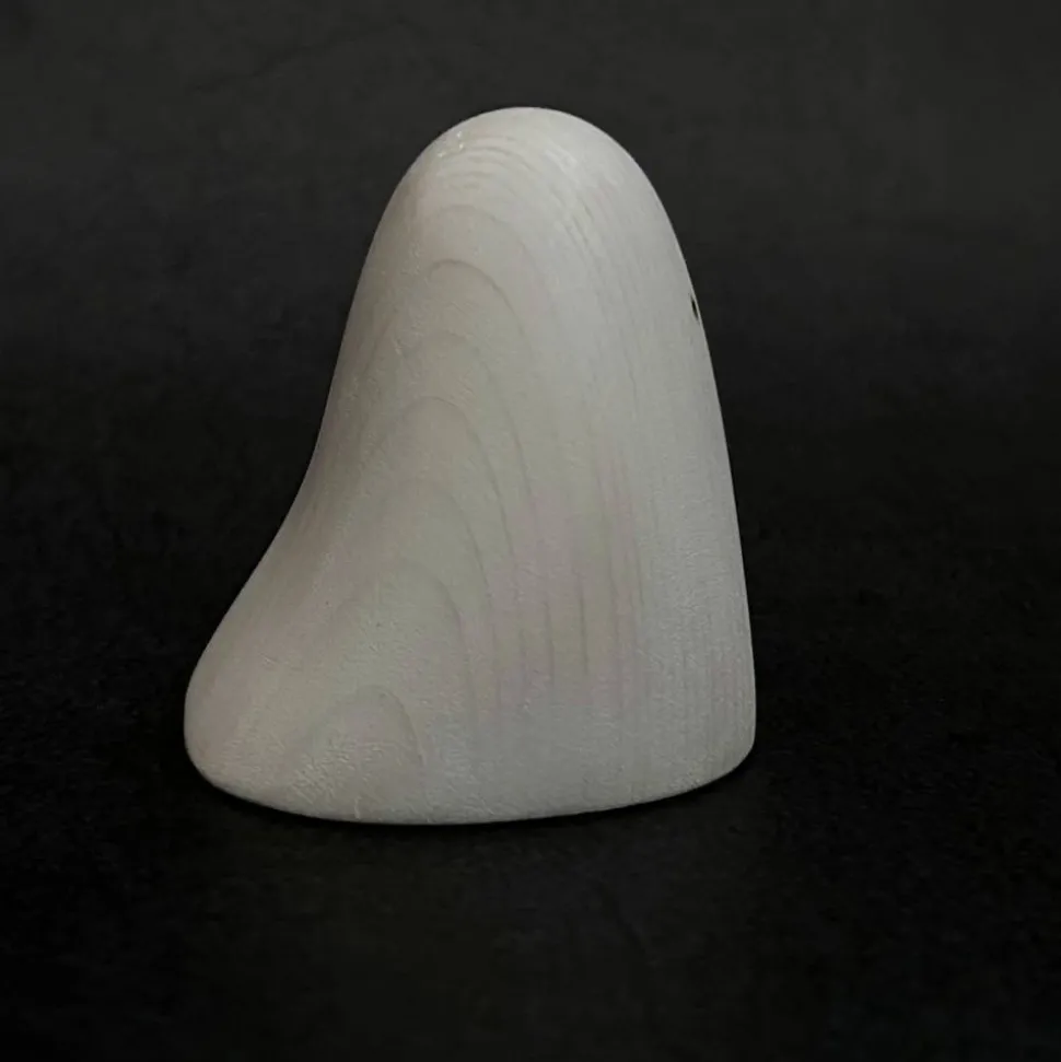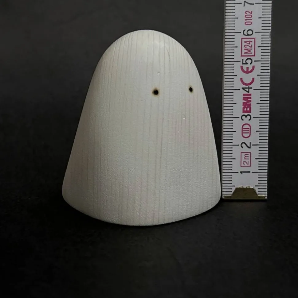 Es ist handgefertigt aus Fichtenholz und mit weißpigmentiertem natürlichen Holzöl behandelt. Die Augen wurden ganz am Ende mit einem Brennstab eingebrannt.