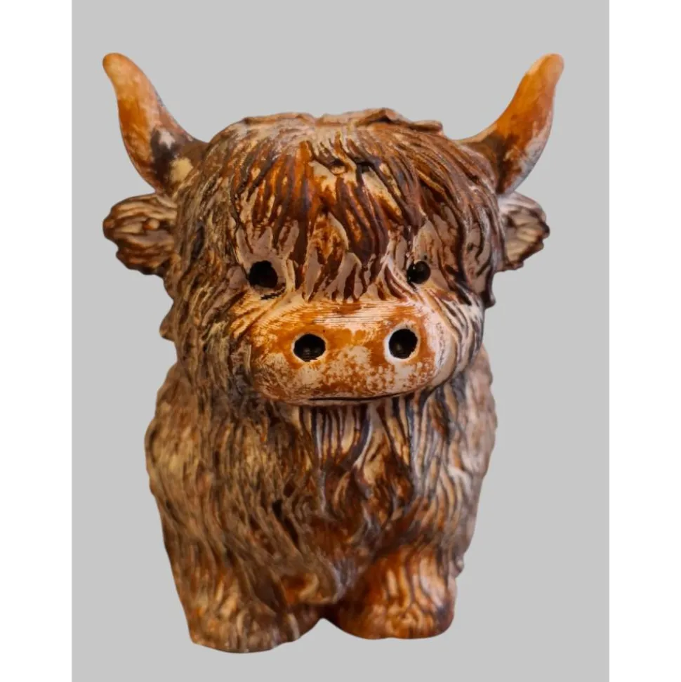 Jedes Hochlandrind wurde von Hand mit Acrylfarbe farblich gestaltet und nicht versiegelt. Nur für den Innenbereich geeignet.