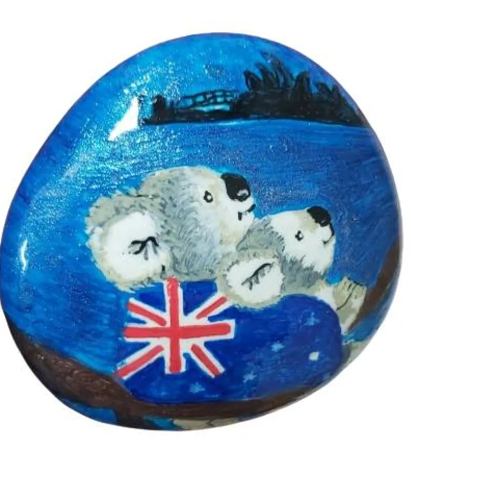 Tauchen Sie ein in die Welt Down Unders und lassen Sie sich von der Schönheit und Gelassenheit des Koalas inspirieren. Jeder Pinselstrich, jedes Detail und jede Farbe auf diesem Stein erzählt eine Geschichte von Abenteuer und Exotik. Der Koala auf dem Baum, umgeben von der australischen Flagge, ist ein Symbol für die Einzigartigkeit und Vielfalt dieses faszinierenden Landes.