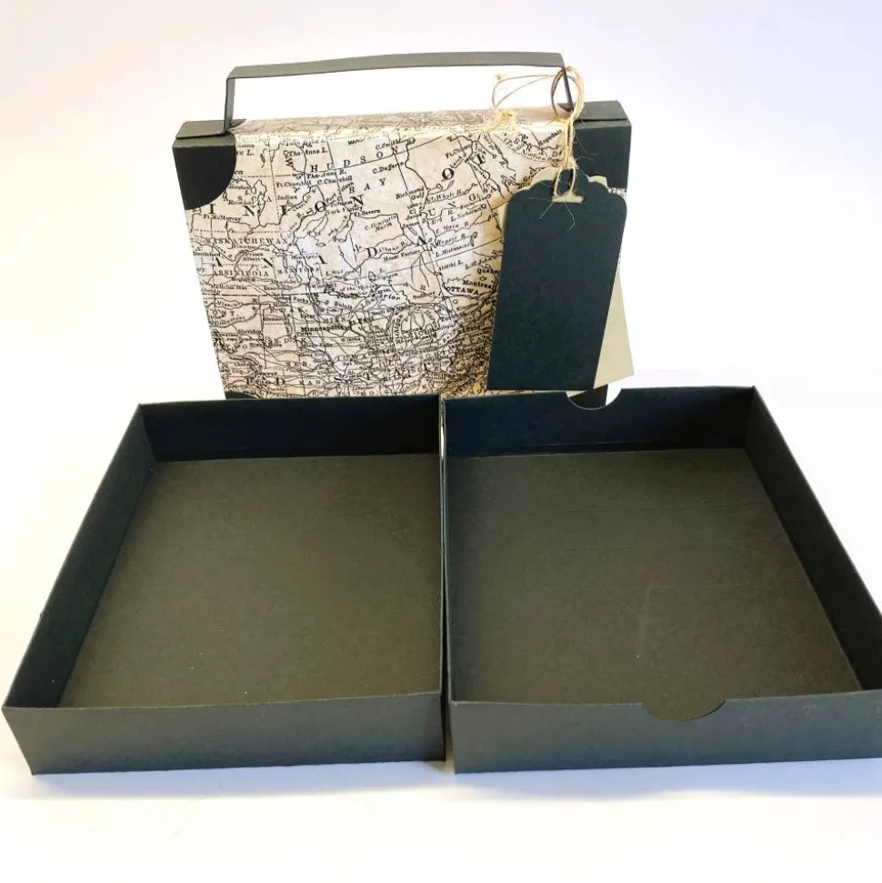 Die innere Schachtel besteht aus Deckel und Boden und kann vom Beschenkten weiterverwendet werden. Zwei unbeschriftete Kofferanhänger bieten Platz für deinen persönlichen Gruß.